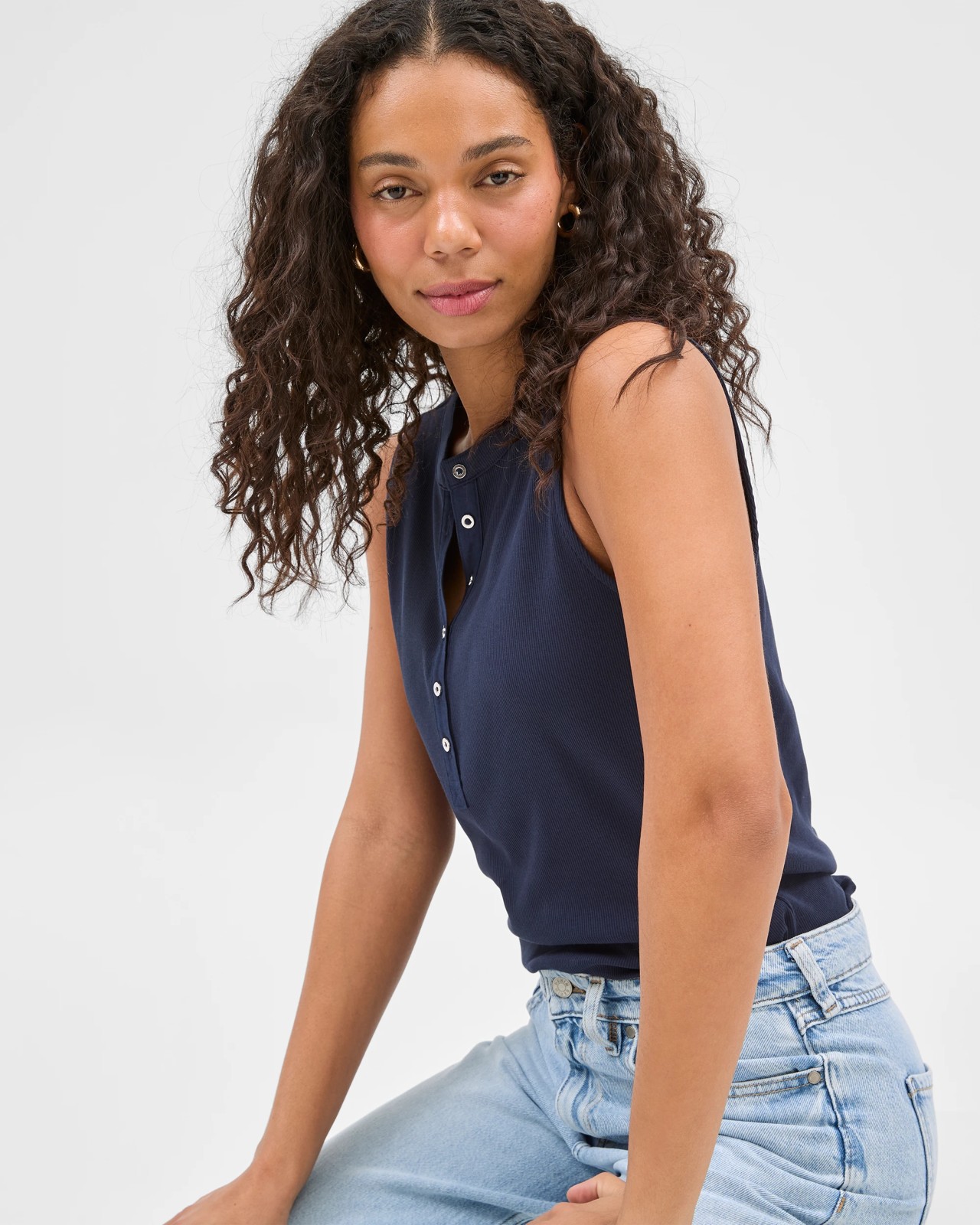 Australian Cotton Ribbed Sleeveless Henley Tank Top - Navy Blue
