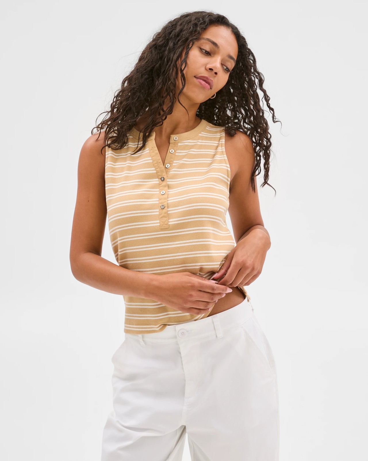 Australian Cotton Ribbed Sleeveless Henley Tank Top - Straw/White Stripe
