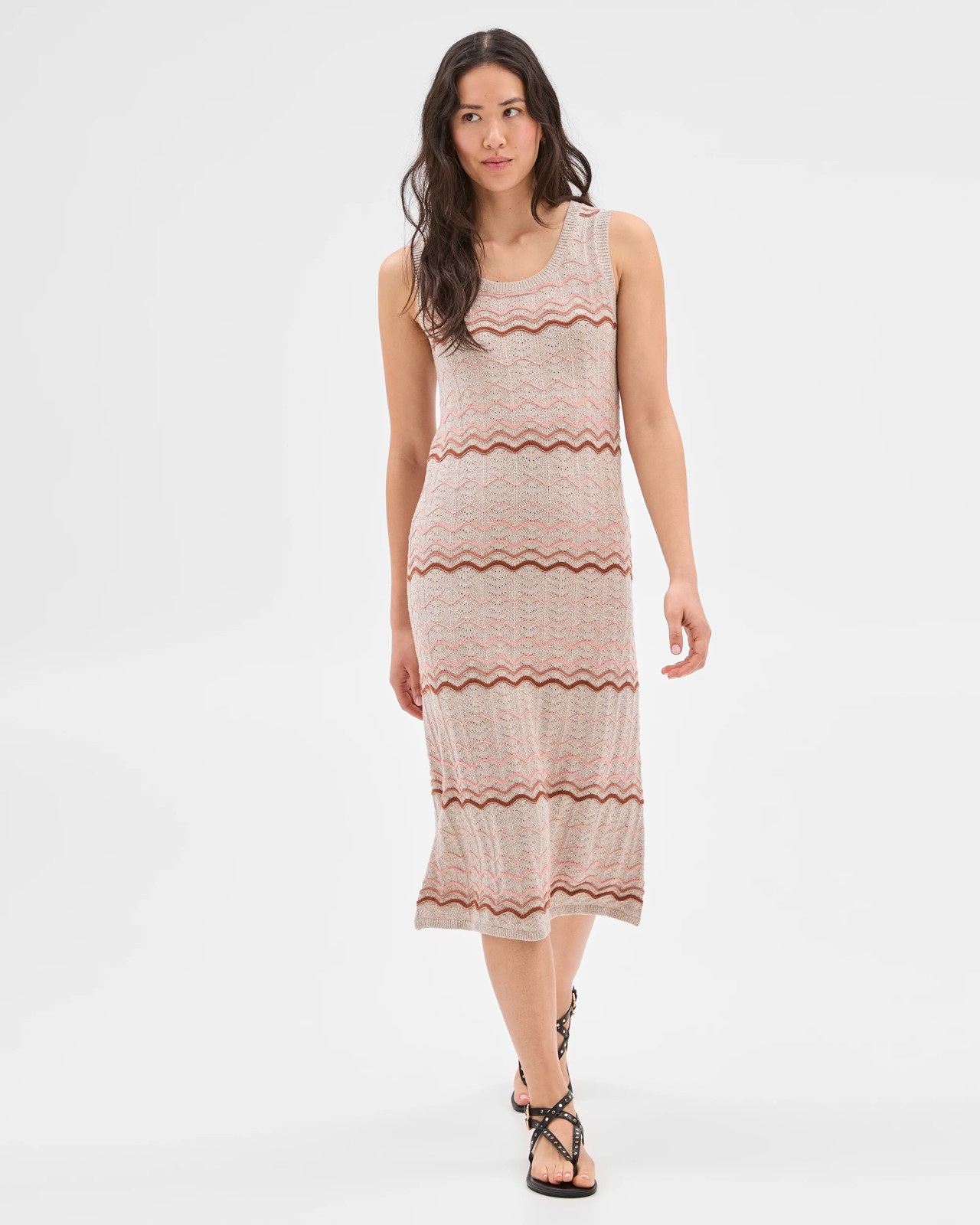 Experience comfort and relaxed sophistication with this Australian cotton sleeveless knit crochet dress. Designed with a lightweight and breathable feel, this piece offers an inviting crochet texture and striking teakwood stripes, perfect for everyday outings or special get-togethers. The ribbed scoop neckline and armholes enhance its easy-going character, while the midi length and straight ribbed hemline introduce a modern vibe. Enjoy the perfect blend of charm and ease, and add this versatile number to your wardrobe for an instantly polished look. Step into your day ready to shine.