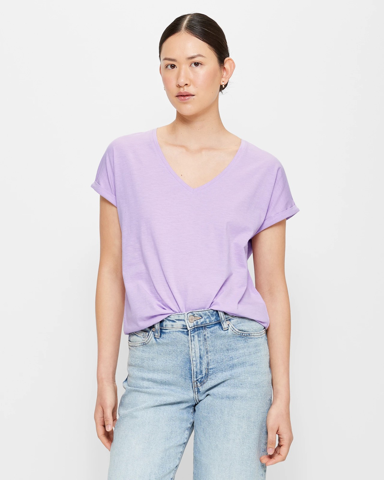 For a soft and comfortable look, our Australian Cotton Slub Slouchy V-Neck T-Shirt is the perfect choice. This regular fit t-shirt has been crafted from an Australian cotton rich fabrication and features a v-neckline and rolled short sleeves for an effortless finish. The curved hemline adds a stylish touch to this piece, making it perfect for everyday wear. Available in a variety of colours, this t-shirt is sure to become your go-to style!