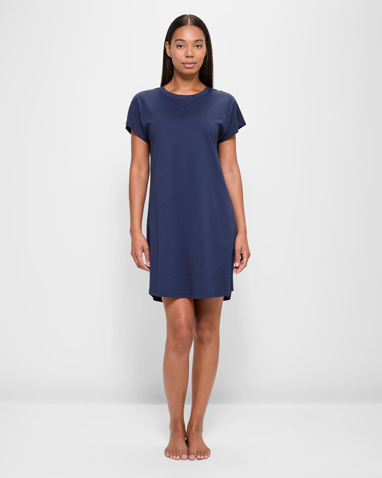 Enjoy unparalleled comfort with our Australian Cotton T-Shirt Nightie, an ideal choice for a serene night's rest. Made from fine cotton, this garment is airy and soft, making it perfect for unwinding at home. In a classy navy blue, it features a casual T-shirt style with a ribbed crew neckline and short sleeves for a comfy fit. The stylish embroidered 'AMORE' on the chest lends a unique touch. Whether you're lounging around or heading to bed, this nightie ensures cosy and pleasant evenings. Indulge in comfort and chic design.
