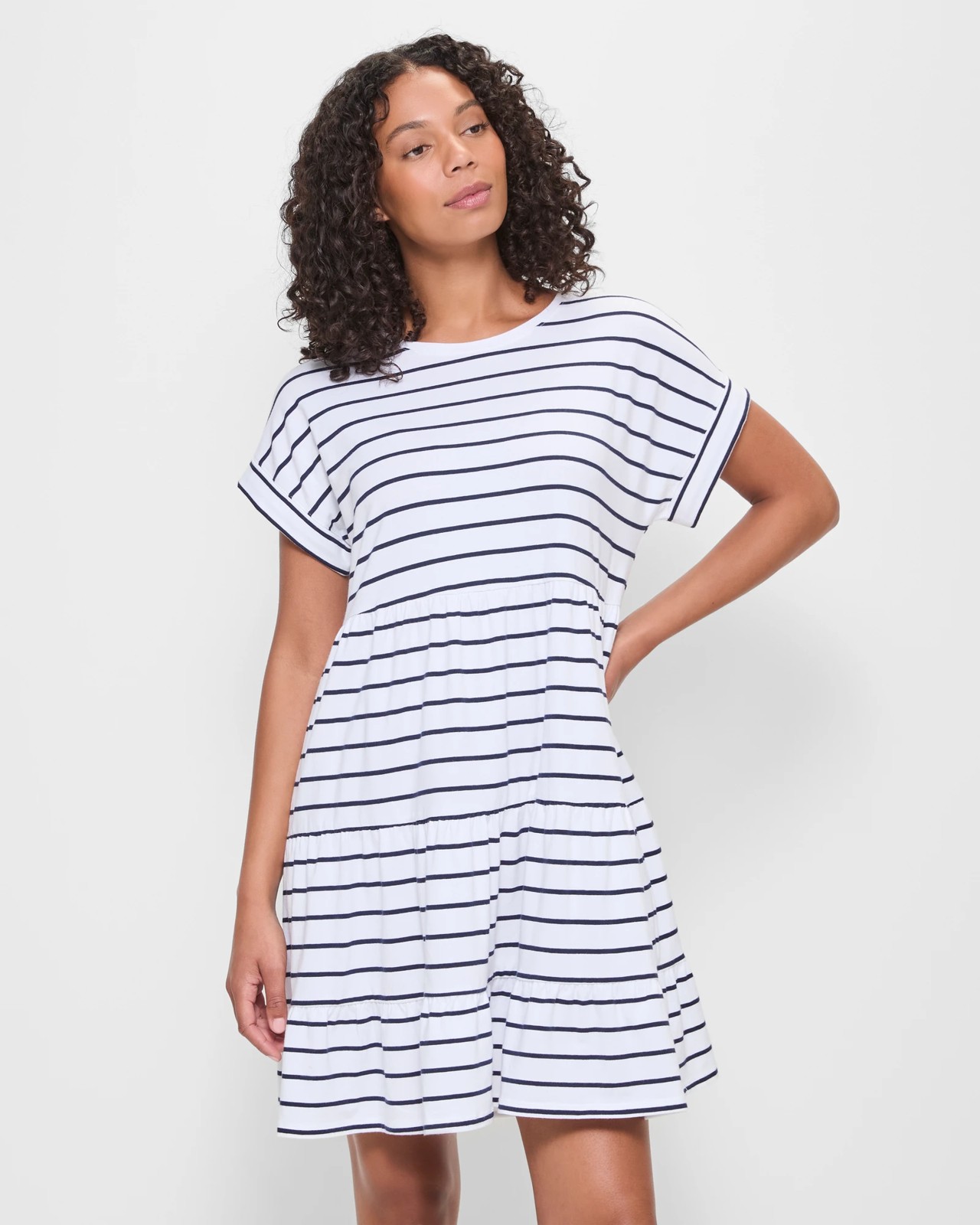 Discover the ultimate blend of style and comfort with our Australian Cotton Tiered Mini Dress. Made using an Australian cotton-rich fabric mixed with elastane, this dress offers excellent flexibility and comfort. Featuring a ribbed crew neckline and charming short roll-cuff sleeves, it's designed to enhance your look effortlessly. With a stretch underbust and tiered panels, it gracefully flows to a flattering mini-length hemline. Experience lightness and ease with this must-have dress, perfect for any wardrobe update. Don't miss out on this fabulous addition!