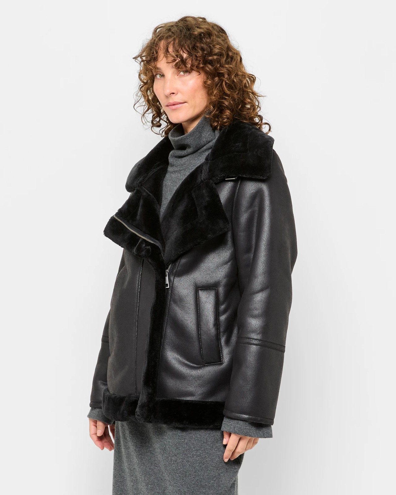 Embrace the cold with our womens Aviator Jacket. Designed from durable polyester, it boasts a textured leather-like exterior and a plush inner lining for ultimate comfort. This classic aviator piece comes in black and features a chic design with a fluffy collared neckline and front lapels. The buckle strap at the collar ensures additional warmth, while the zip-through front and pockets offer convenience. Its regular fit and fluffy hemline make it a stylish choice for any winter outfit. Add this timeless jacket to your collection today!