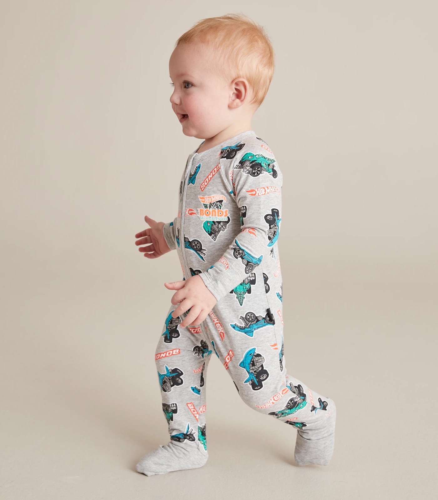 Crafted from soft cotton with great stretch and an all over Hot Wheels print comes the Baby Bonds x Hot Wheels Zippy Coverall.