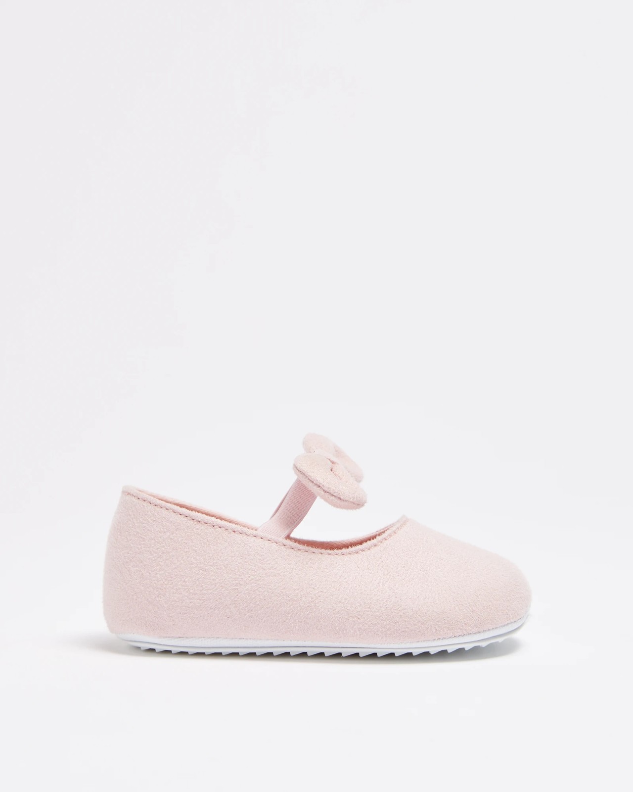 The baby bow ballet shoes feature an outer suede look and have a bow deatil over elastic strap. They have extra padding added to the insock for improved underfoot comfort.