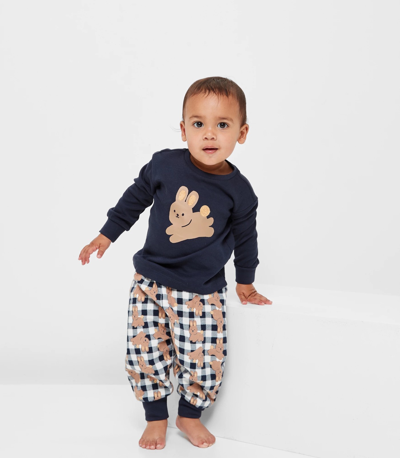 Make bedtimes extra cute and snuggly with our Baby Bunny Cotton Pyjama Set. Crafted from soft and breathable cotton, this sleep set is perfect for keeping your little one comfortable all night long. The set includes a navy blue top with a ribbed crew neck and long sleeves, featuring a large bunny print on the front with boucle detailing for added charm. The straight hem adds a touch of style to the top. The matching flannette pants feature a chequered bunny print and have an elastic waistband for a secure fit. With ribbed cuffs to keep the pants in place, your baby will look adorable and feel cosy. Get your little bunny ready for a peaceful night's sleep in this delightful pyjama set.
