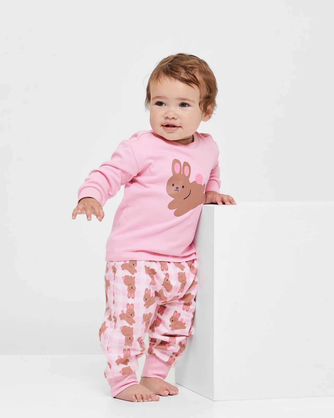 Introducing our adorable Baby Bunny Cotton Pyjama Set. Made from soft and breathable cotton, this two-piece sleep set is perfect for keeping your little one comfortable and stylish throughout the night. The pyjama top features a ribbed crew neck, long sleeves with ribbed cuffs, and a large bunny print on the front with boucle detailing for a cute touch. The straight hem adds a neat and tidy finish. The matching bunny flannelette print pants have an elastic waistband and ribbed cuffs for a secure and cosy fit. Treat your baby to a good night's sleep with our charming bunny pyjama set.