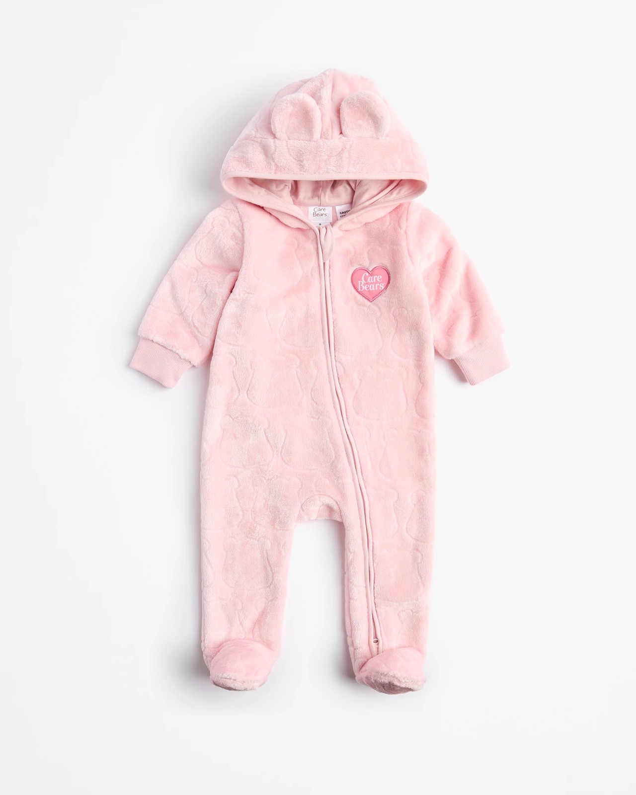 Envelop your little one in the perfect blend of comfort and cuteness with the Baby Care Bears Hooded Fleece Coverall. Made from plush fleece, it showcases a delightful all-over Care Bears jacquard print and a sweet heart applique on the chest. The cosy hood is fully lined and features charming 3D bear ears, adding a playful touch. Practicality meets adorableness with the 2-way zip front, making dressing and nappy changes simple. Ribbed cuffs on the arms and legs provide a secure fit while the covered feet keep their tiny toes warm. This coverall expertly combines warmth, comfort, and an irresistible design. Give your baby the joy of cosiness with this charming coverall.