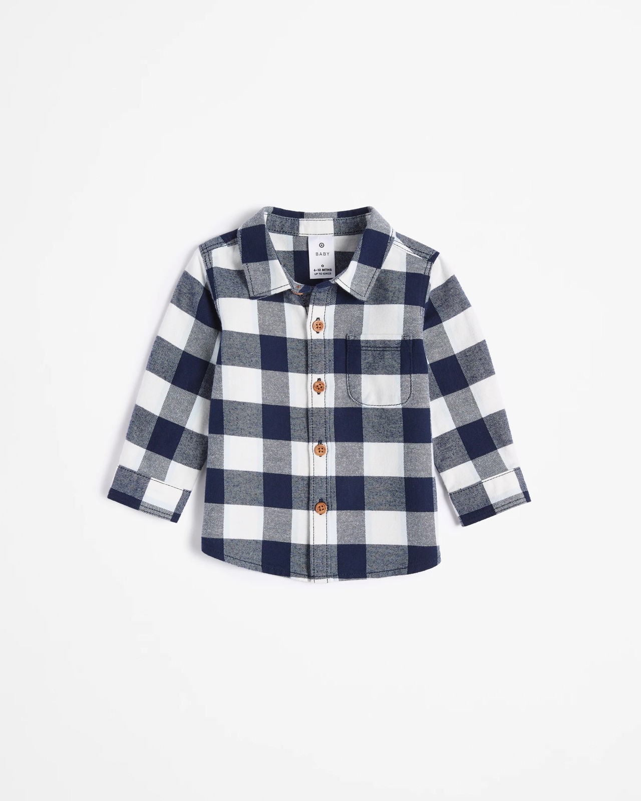 Introduce your little one to timeless style with our Baby Check Flannelette Shirt in classic Navy Blue. Made from soft, breathable cotton, this regular-fit shirt ensures comfort throughout the day. Its check flannelette design adds a touch of sophistication, perfect for any occasion. The shirt features a classic collar, a convenient button-down front, and long sleeves with buttoned cuffs. A handy chest pocket and stylish curved hem round out this versatile piece. Whether buttoned up for a smart look or worn open over a t-shirt for a casual vibe, this shirt is a must-have for your baby's wardrobe. Make sure to add this charming piece to your cart today.