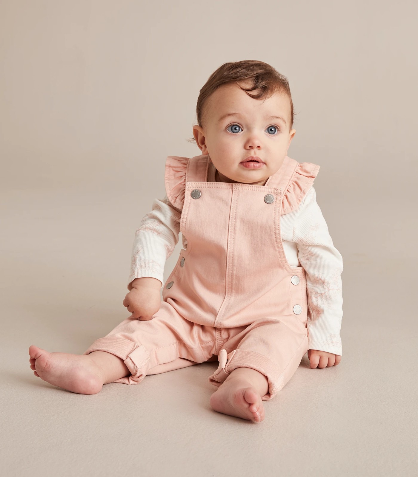 In a cotton rich poly blend denim, the pink Baby Denim Overall features adjustable length press stud shoulder straps with frill trim and side press studs at hips for quick and easy changes.