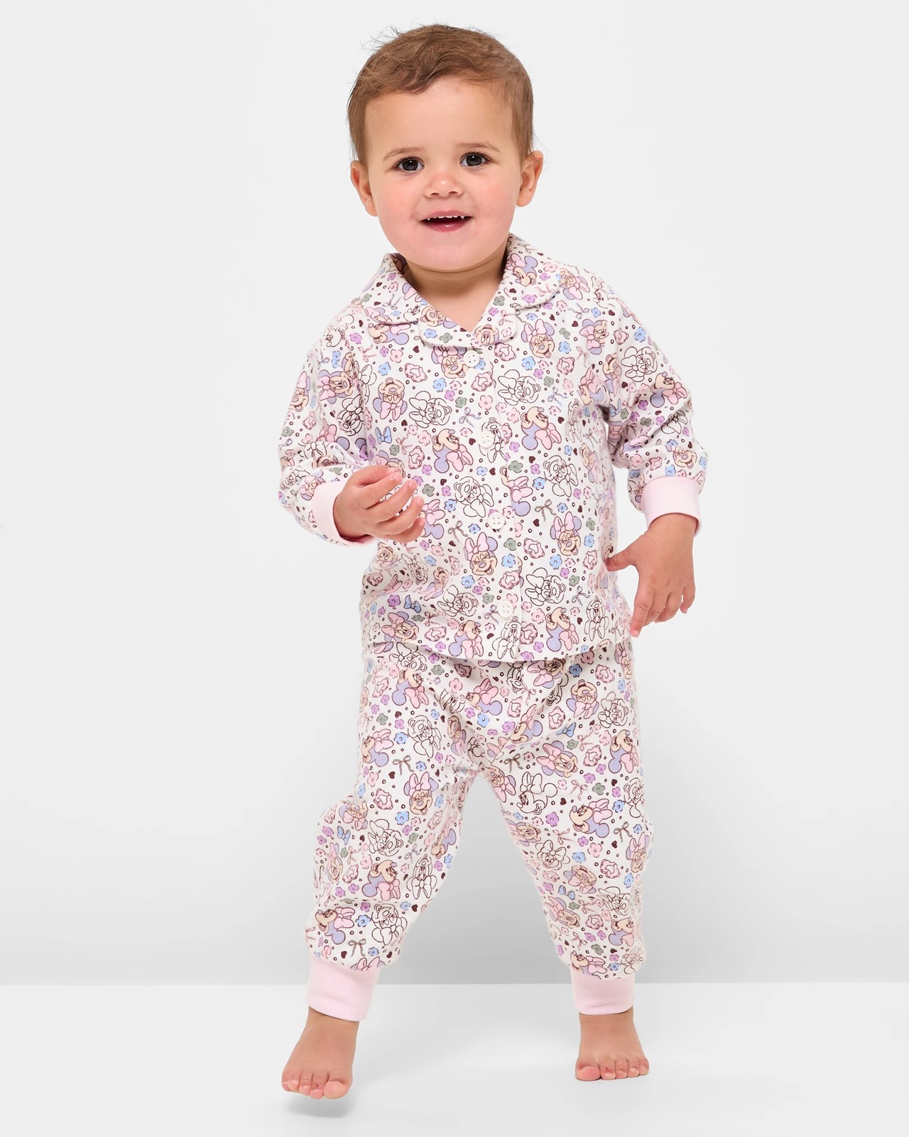 Dress your baby in comfort and style with this delightful Disney Minnie Mouse pyjama set. Made from soft cotton flannelette, this cosy 2-piece ensemble features a charming cream colour with an all-over Minnie Mouse print. The regular fit ensures freedom of movement, while the button-up front and collared shirt add a touch of classic appeal. The long sleeves have ribbed cuffs to keep little arms warm, and the matching pants with an elastic waistband and cuffed ankles provide a snug fit. Ideal for bedtime, this set will make your baby look forward to sweet dreams with Minnie Mouse! Treat your little one to this charming sleepwear set today.