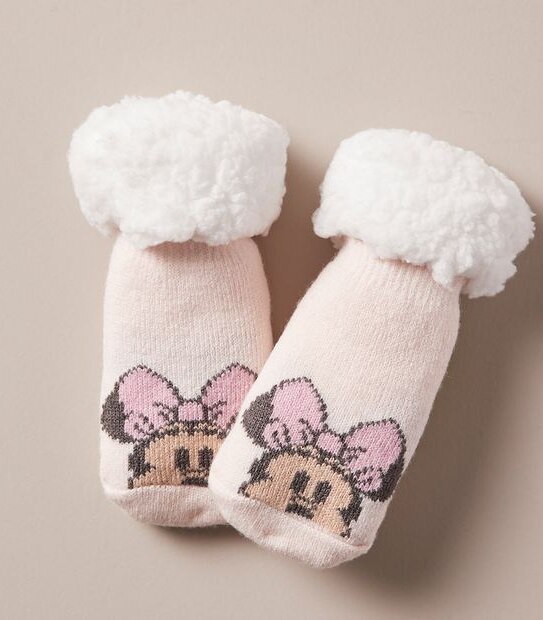 Bubs will stay warm and toasty this season in the Baby Disney Minnie Mouse Fleece Home Socks, featuring a pattern on the front and grip dots on the sole.