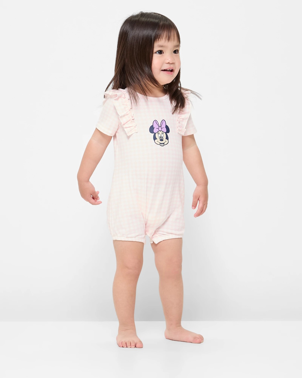 Placement print on pink gingham and an All over Minnie Mouse print
