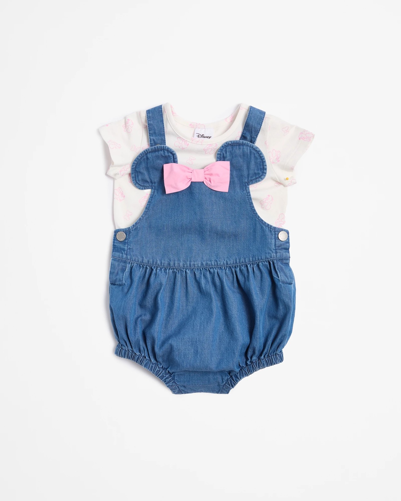 Dress your precious one in this adorable Baby Disney Minnie Mouse Shortall and Tee Set. Made from soft, cotton fabric, this two-piece ensemble ensures comfort and style. The chambray denim shortall features charming Minnie Mouse ears shape with a delightful 3D pink bow, adding an enchanting touch. With adjustable press studs on the shoulder straps and single buttoned hips, dressing is made easy, while the elasticated legs and press studs at the crotch ensure a snug fit. Perfect for any little Disney fan, this set is a must-have for everyday wear or special occasions. Bring home this cute and comfy set today.