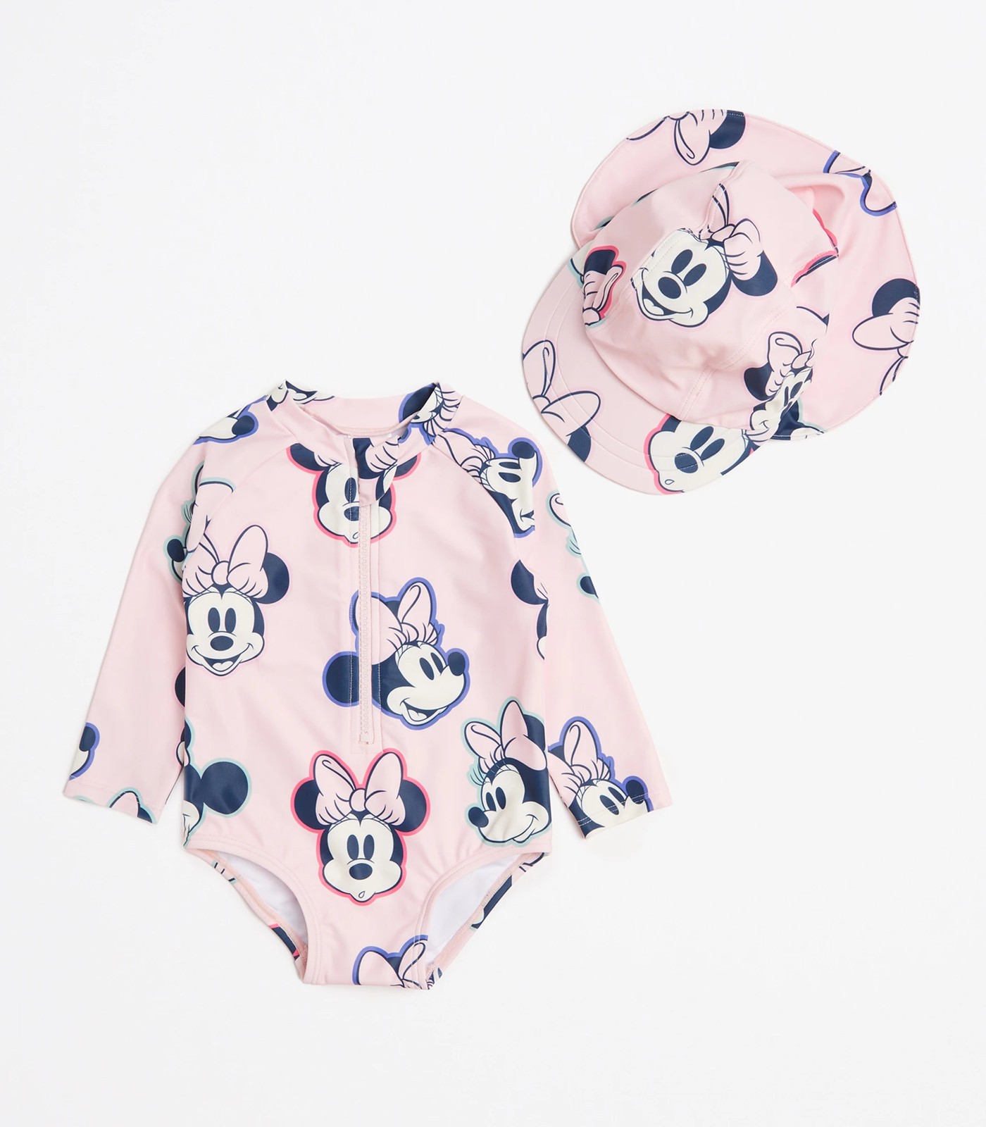 Your little one will stay protected from the sun's harmful rays with UPF 50+ sun protection while enjoying great stretch and freedom of movement in the water with the long raglan sleeve unitard. The pink all-over Minnie Mouse print adds a touch of fun to the 2-piece set. The stand collar and zip front provide a comfortable fit, and the matching hat with neck flap ensures that your child's delicate skin stays safe from the sun. Plus, the set is fully lined for added comfort and durability. Get your little one ready for a day at the beach or pool with this cute and practical Disney swim set.