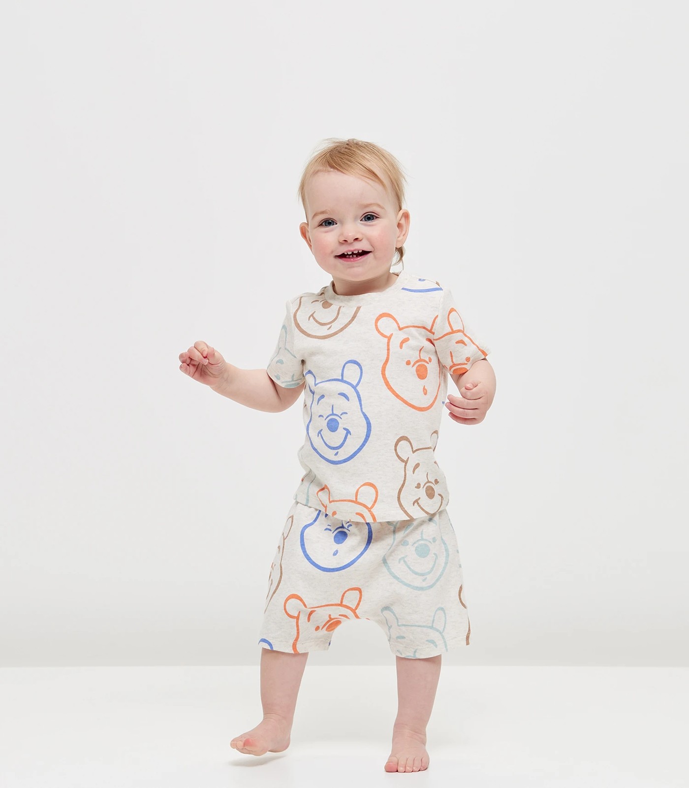 Make bedtime extra special with this Baby Disney Winnie The Pooh Pyjama Set. Crafted from a cotton-rich blend, this set is designed for a regular fit and includes a two piece set with an oatmeal all over Winnie The Pooh outline print. The top features a crew neckline, short sleeves and a straight hem. Complete with matching shorts featuring an elastic waistband and short length for comfort. Perfect for snuggling up in style!