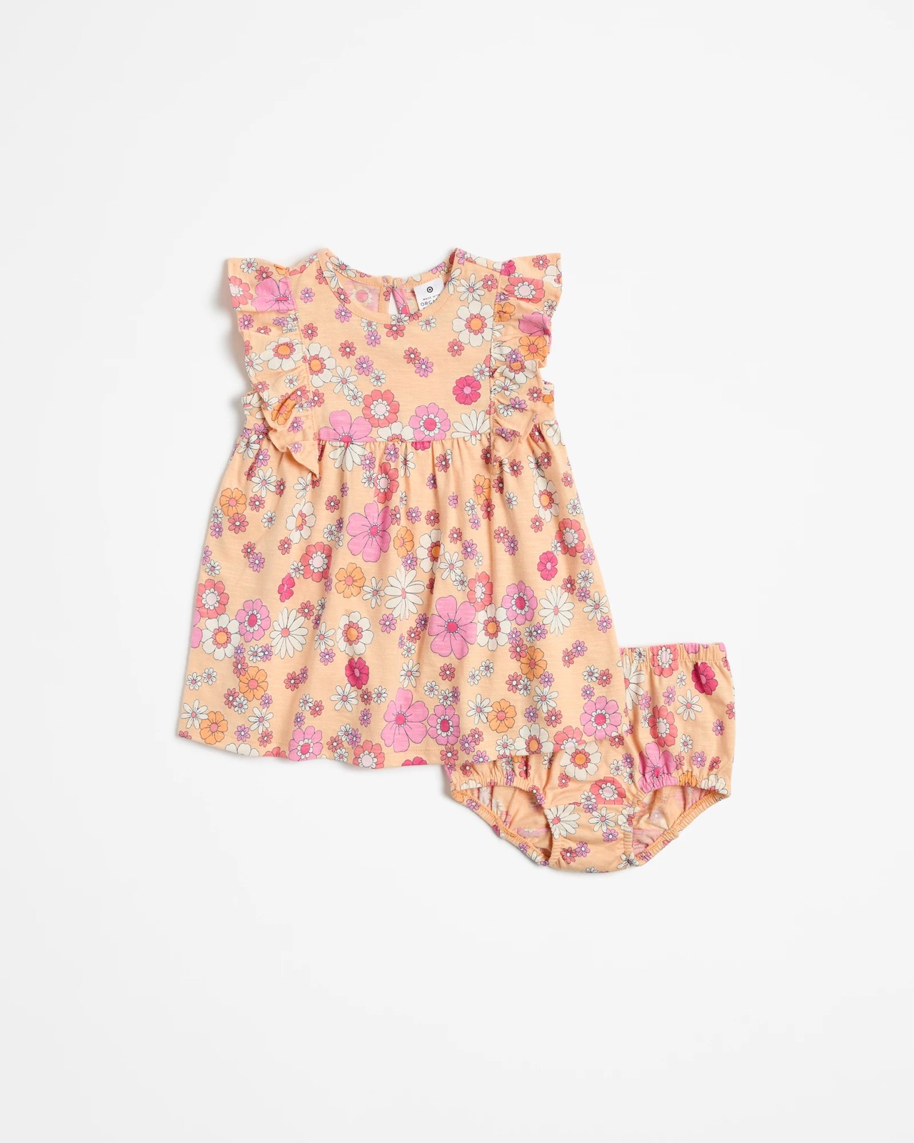 Your baby will look absolutely charming in this Baby Dress and Bloomer Set. Made from soft cotton, this two-piece outfit offers both comfort and style. Featuring an all-over print, the dress includes a round neck with delicate frill shoulder trims and a gathered waistline for a delightful look. The sleeveless design and button-up back make dressing your little one a breeze. Complemented by a matching bloomer with an elastic waistband and leg cuffs, this set is perfect for any occasion. Add this sweet ensemble to your baby's wardrobe today.