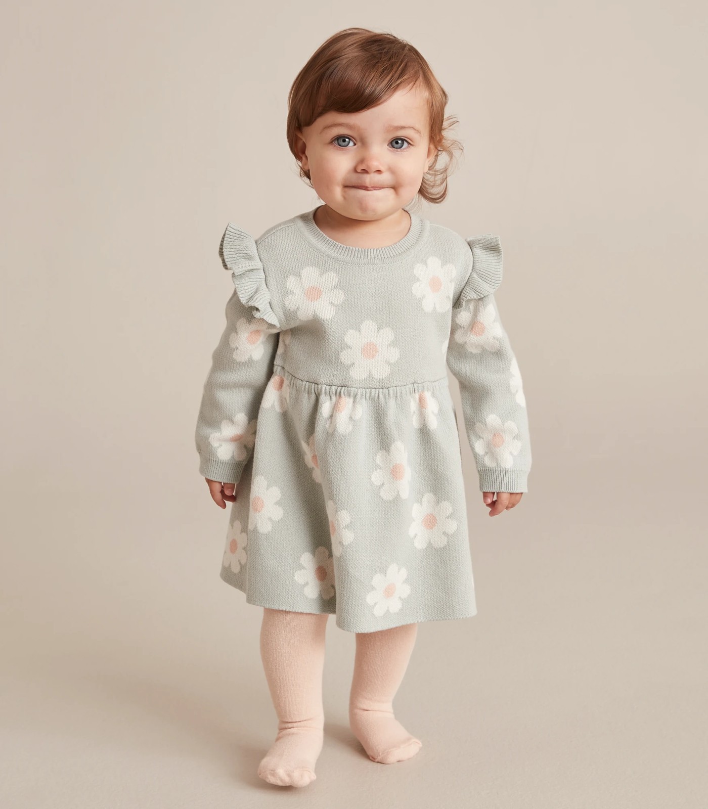 A quick and easy outfit for bubs comes the Baby Dress and Leggings Set, featuring a knit daisy print dress with frill shoulder detailing with knit tights.