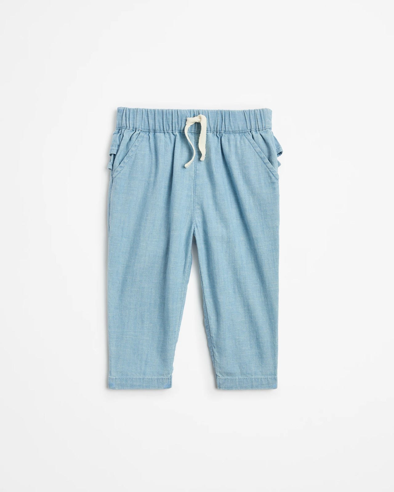 Introduce your little one to stylish comfort with our Baby Frill Back Chambray Pants. Made from a high-quality cotton-linen blend, these trousers promise softness that's gentle on your baby's delicate skin. The regular fit and elastic waistband with drawcord ensure ease of movement and a secure fit, while the adorable frill back detailing adds a charming touch. In a versatile blue shade, these pants feature convenient side pockets and a regular length for everyday wear. Dress your baby in the perfect combination of practicality and cuteness. Get a pair today!