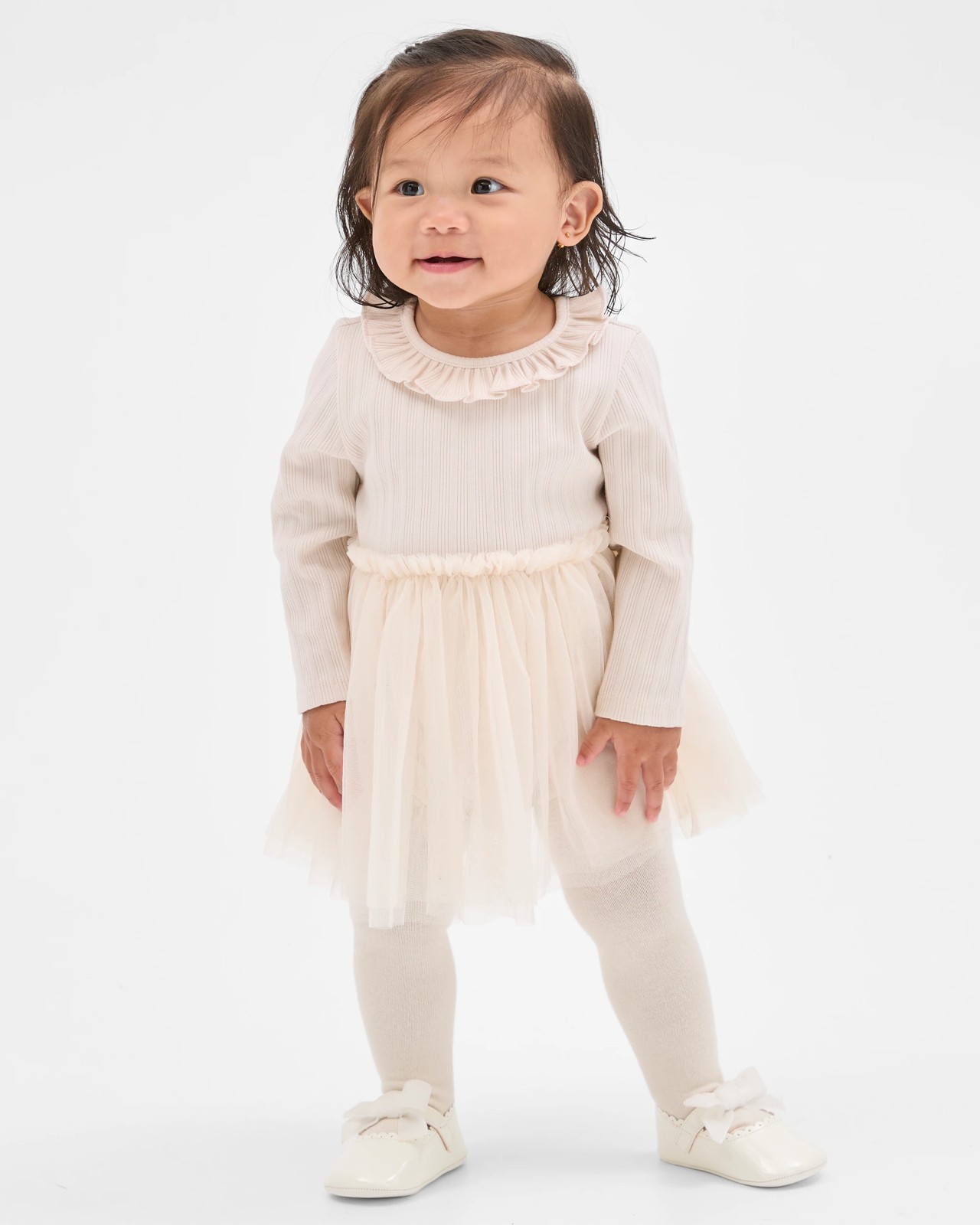 Watch your little darling light up the room in this adorable baby girl long sleeve rib tutu dress bodysuit. Made with a soft cotton-rich blend and a touch of elastane for easy movement, this sweet outfit keeps your child comfortable all day. The charming tulle skirt and playful frills on the shoulders create a look that's perfect for fun occasions and treasured everyday moments. Featuring a convenient crew neck, long sleeves, and simple metal ring press snaps at the crotch, changing is hassle-free. Give your baby a combination of cute style and everyday practicality—add this delightful tutu dress bodysuit to your collection now.