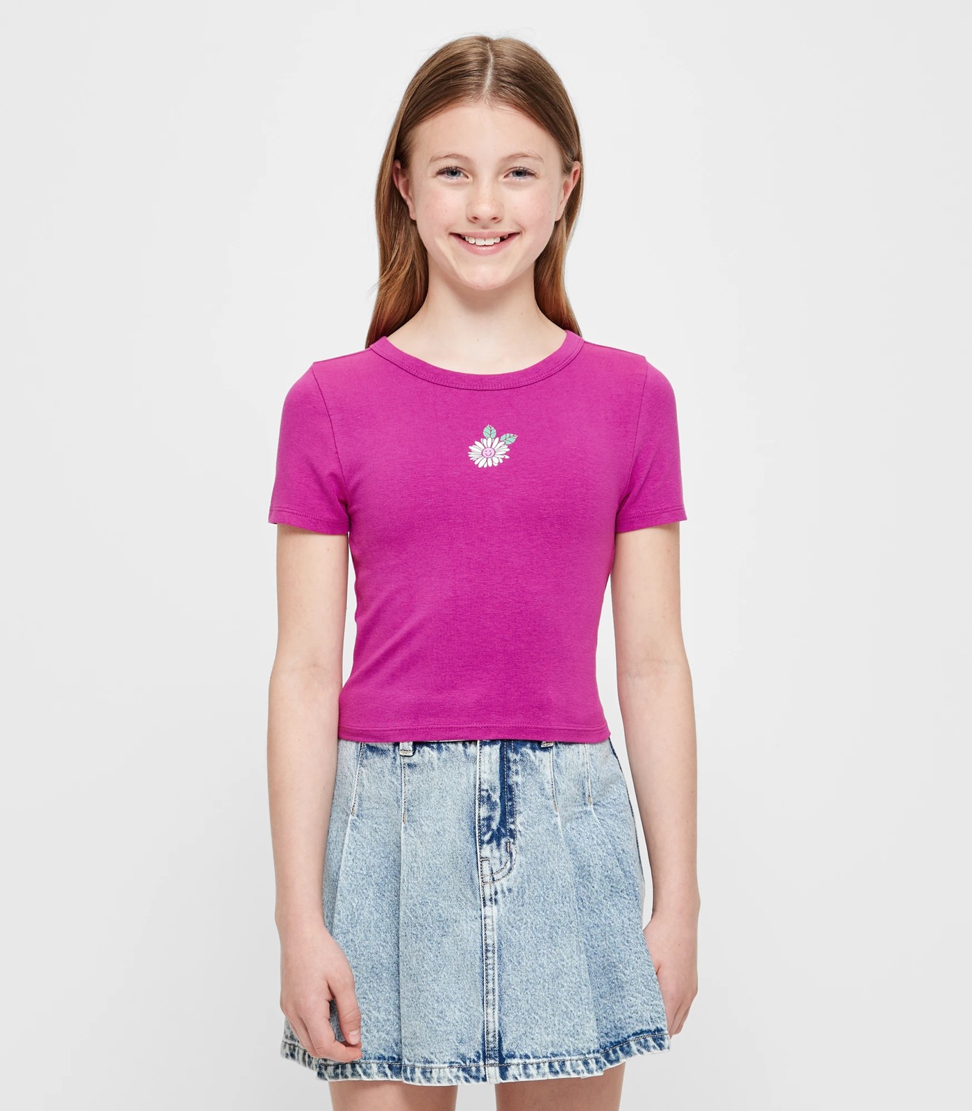 Introducing our trendy Baby Graphic Print T-shirt! Crafted with soft and stretchy cotton, this cute girls' t-shirt offers a baby cropped fit for comfort and style. The pretty pink colour adds a touch of charm, while the crew neck and short sleeves ensure a relaxed fit. It features a small flower print on the chest, adding a delightful detail. The straight hem completes the look. This t-shirt is perfect for everyday wear and will make your little one stand out in style.