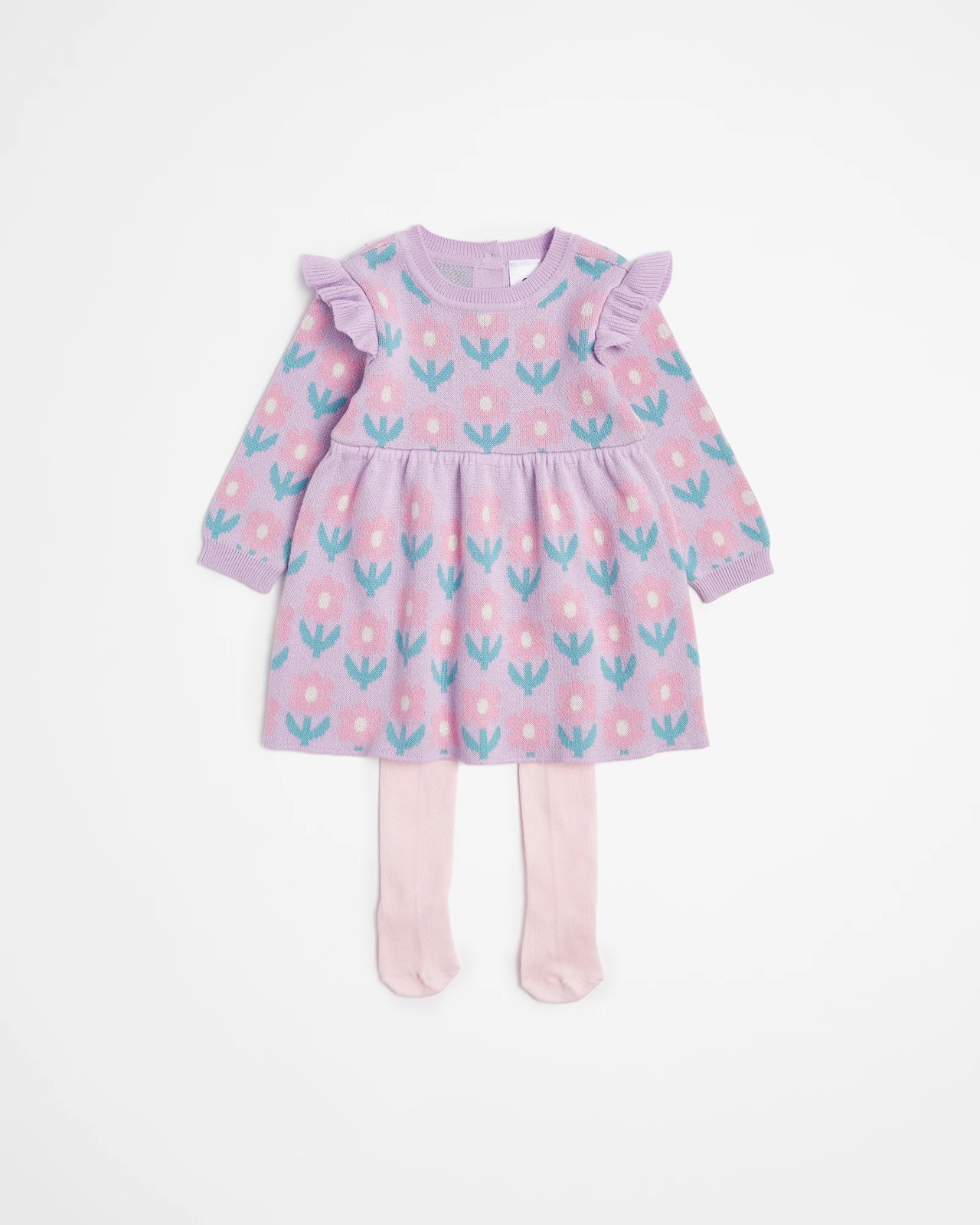 Dress your little one in adorable comfort and style with this charming baby knit dress and tights set. Crafted from a cotton-rich knit, this two-piece set features a regular fit and is both soft and stretchy, ensuring all-day wearability. The crew neckline and Intarsia Knit design adds a sweet touch, while the long sleeves with frill shoulder detail and elastic waistband on the tights provide both flair and flexibility. With a button-down back and covered feet, this outfit is not only practical but also irresistibly cute. Elevate your baby's wardrobe with this delightful ensemble.