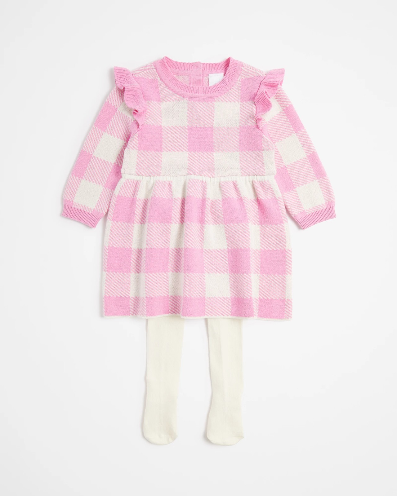 Dress your little one in adorable comfort and style with this charming baby knit dress and tights set. Crafted from a cotton-rich knit, this two-piece set features a regular fit and is both soft and stretchy, ensuring all-day wearability. The crew neckline and Intarsia Knit design adds a sweet touch, while the long sleeves with frill shoulder detail and elastic waistband on the tights provide both flair and flexibility. With a button-down back and covered feet, this outfit is not only practical but also irresistibly cute. Elevate your baby's wardrobe with this delightful ensemble.