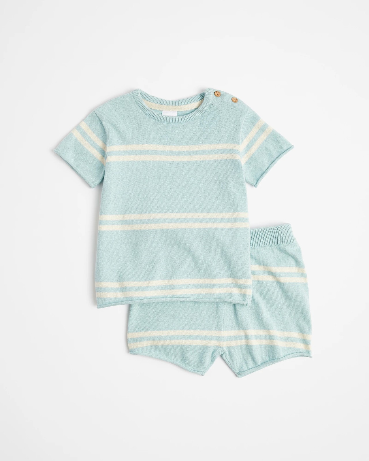 Crafted from a cotton rich knit, this set offers a regular fit that allows for easy movement. The adorable all over stripe pattern adds a touch of charm to the ensemble. The crew neck and short sleeves provide a casual yet polished look. With buttons on one shoulder, changing your baby becomes a breeze. The matching shorts feature an elastic waistband for a secure yet comfortable fit. This two-piece set is perfect for everyday wear or special occasions.