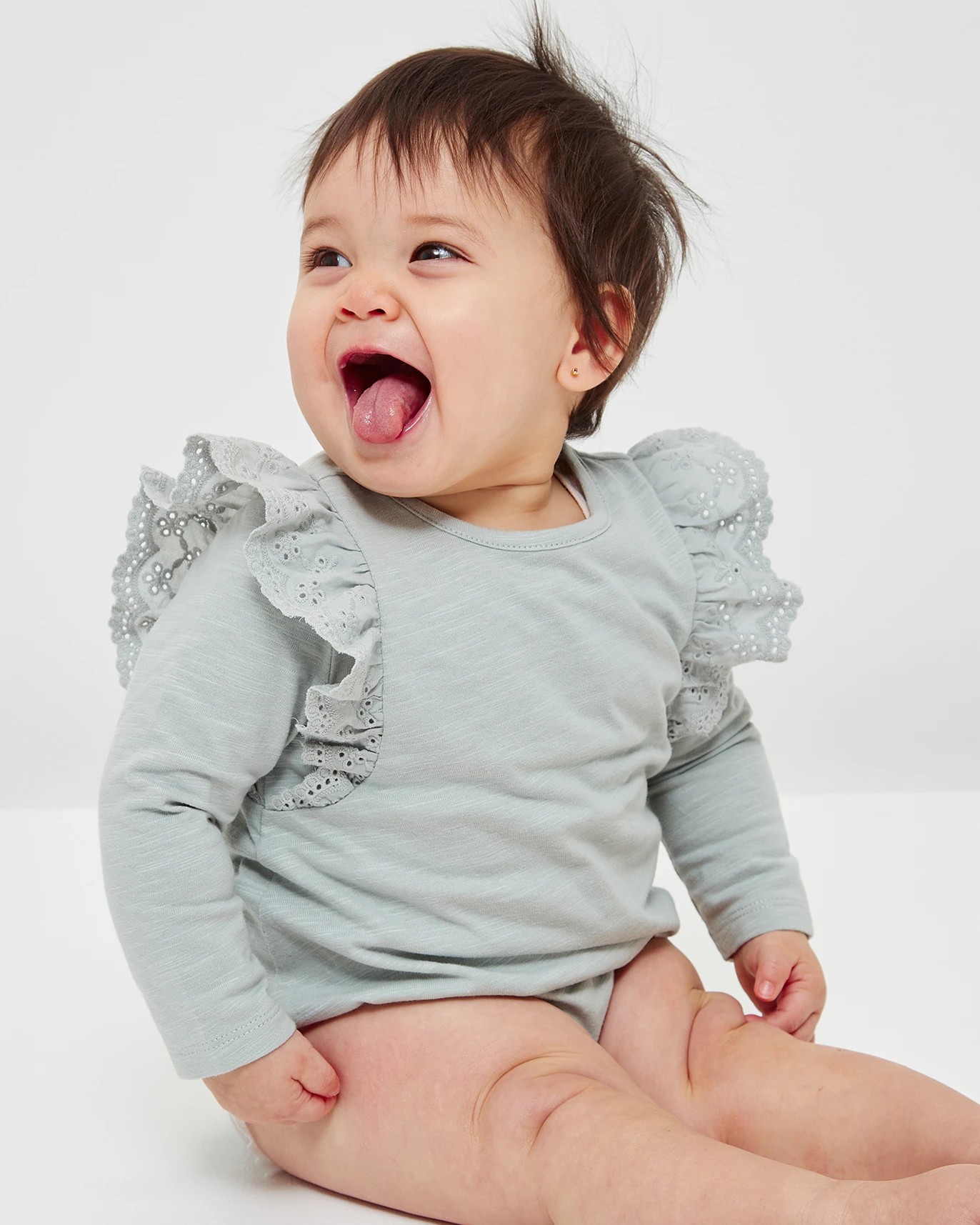 Welcome your little one to the world of style and comfort with this adorable baby long sleeve bodysuit from Target Baby. Crafted from soft cotton, this regular fit bodysuit features a crew neck, long sleeves with frill broderie shoulder trim, press studs at the crotch for easy changing and elastic leg openings for optimum movement. Finished with a button down centre back neck, this lightweight bodysuit is sure to be an essential all-year-round item in your baby's wardrobe.