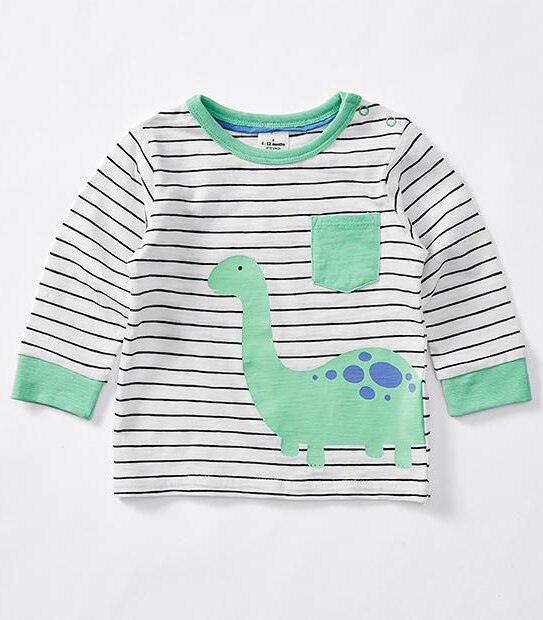 Our long sleeve dinosaur print T-shirt features a snap stud closure on one shoulder and is crafted in a soft, breathable cotton fabric.- All over stripe print with dinosaur on front.