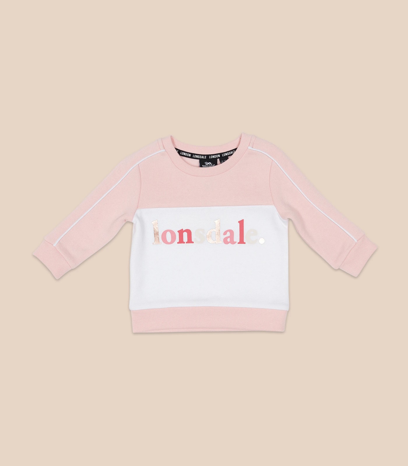 The super cute Lonsdale Frankie spliced crew will be a great addition to your little ones wardrobe. Featuring a playful waterbased Lonsdale logo print on chest, rib cuffs and hem for comfort and made from a soft cotton blend. Wear it back with the matching Casey Trackpant to complete the look.
