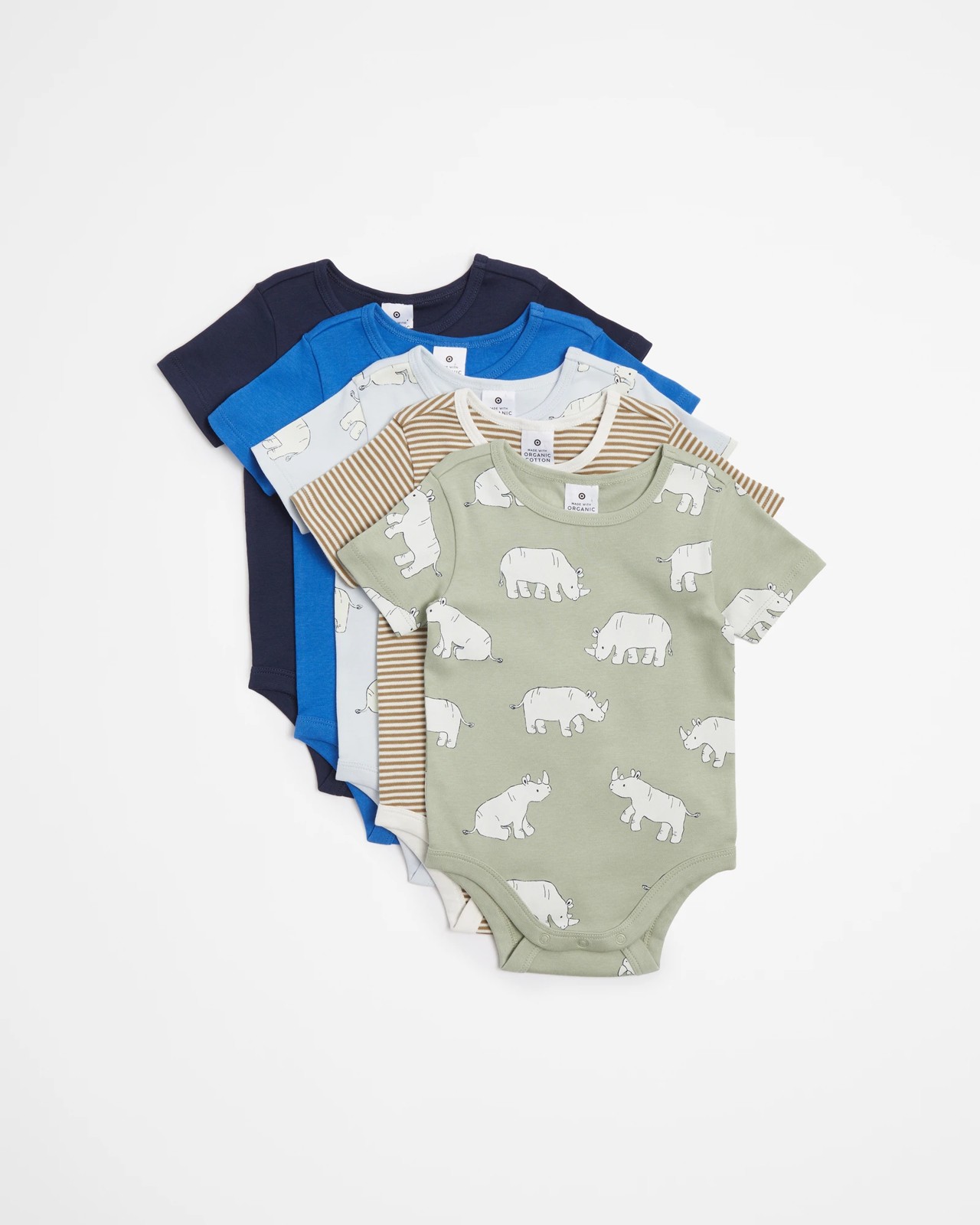 These bodysuits come in a regular fit and a variety of colours and prints, ensuring that you can find the perfect match for your baby's unique personality. This 5 pack of bodysuits features a round neck and short sleeves, making them versatile for any occasion. The press studs to crotch make changing your baby a breeze, ensuring that you can get them in and out of their bodysuit with ease. Made from high-quality organic cotton, these bodysuits are gentle on your baby's delicate skin, ensuring that they stay comfortable all day long. With this 5 pack of baby bodysuits, you can rest assured that your baby is dressed in style and comfort.