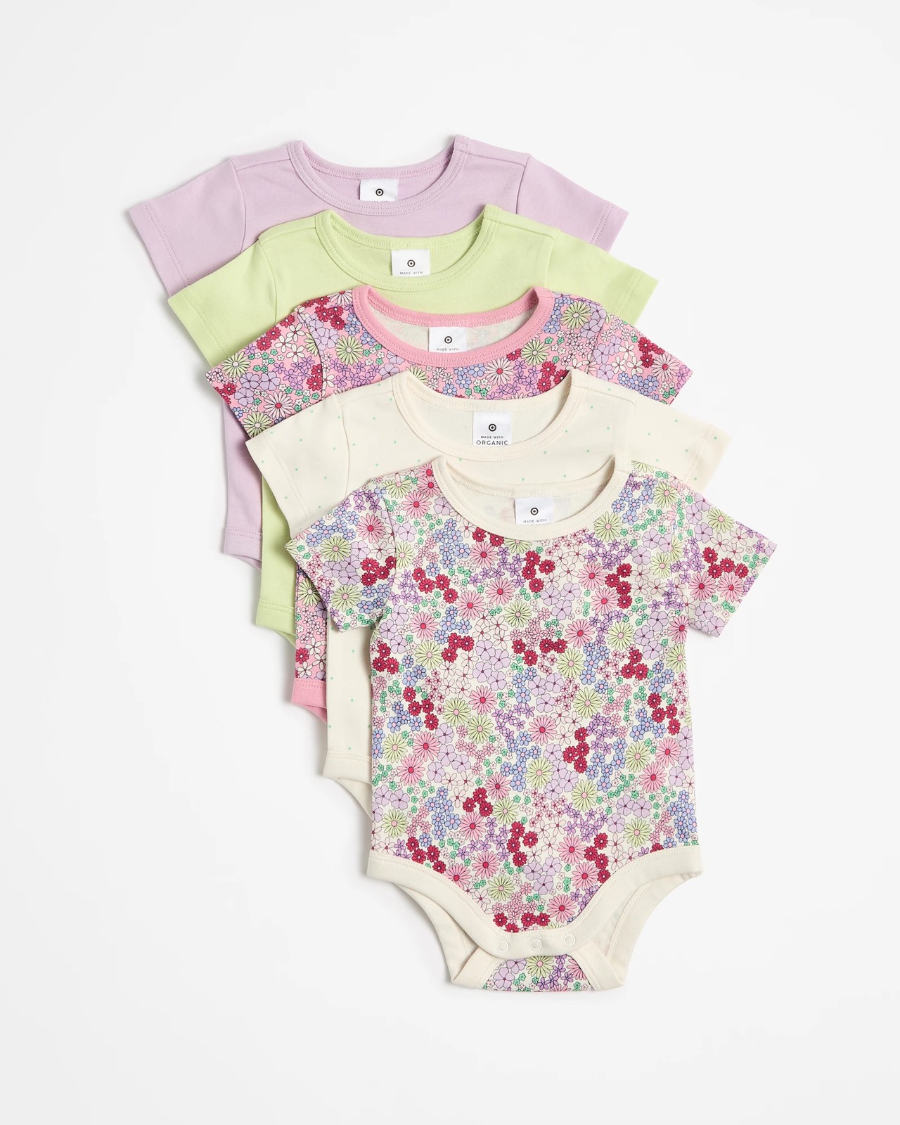 Introduce your baby to cosy comfort with our Baby Organic Cotton Bodysuits 5 Pack. Made from soft, breathable organic cotton, these bodysuits are ideal for your newborn's delicate skin. Featuring a regular fit, they come in an array of charming colours and prints. The round neck and short sleeves offer ease of dressing, while the press studs at the crotch ensure quick and easy nappy changes. Enhance your baby's wardrobe with these must-have essentials and enjoy the perfect combination of style and practicality.