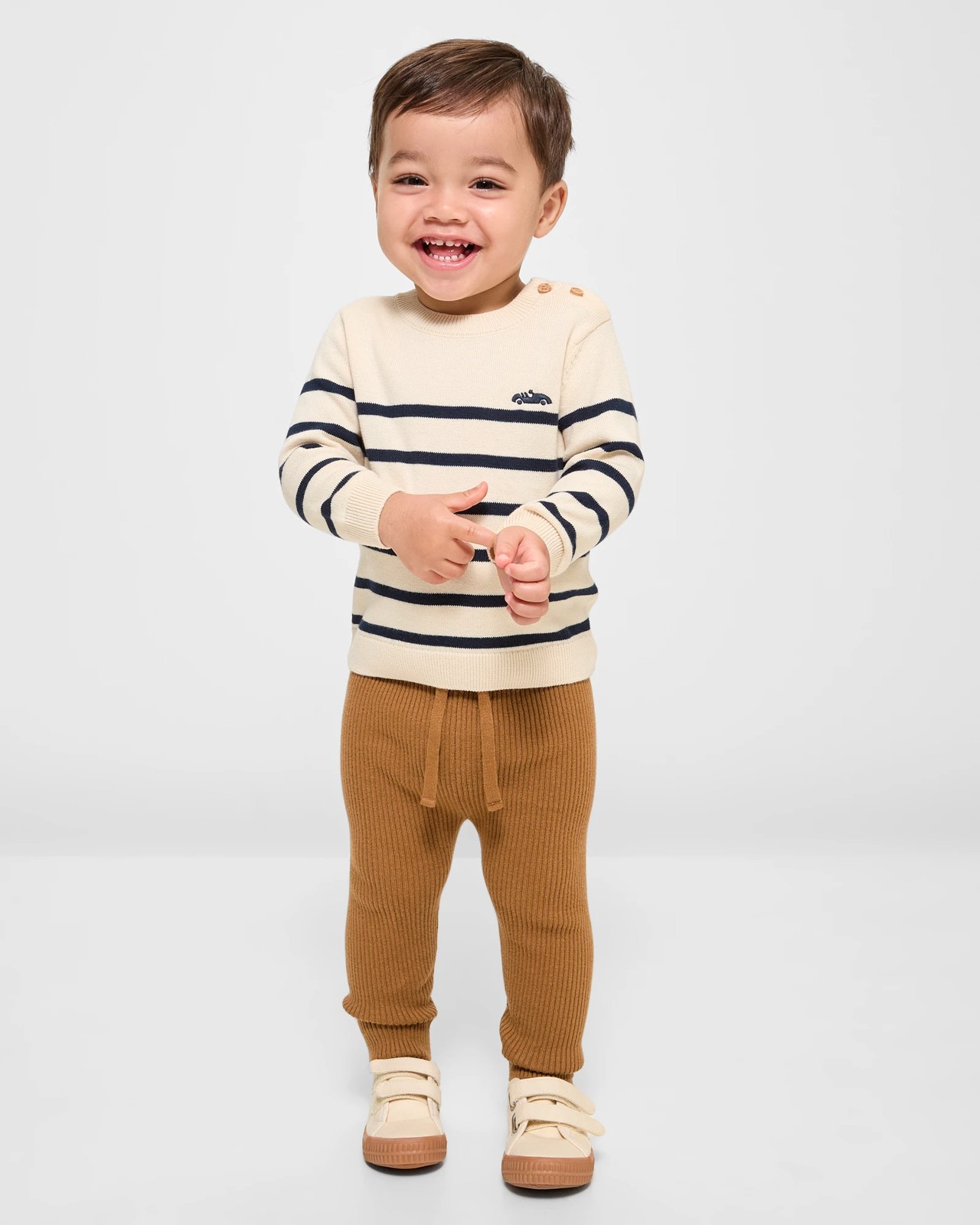 Dress your little one in these remarkably soft Baby Chunky Rib Knit Pants in a rich chocolate hue. Made with a cosy cotton blend, these leggings-style trousers feature a trendy chunky rib knit texture and an elastic waistband with a stylish faux drawcord for easy dressing. Their long length provides extra warmth, making them perfect for chilly days. Pair them with the matching jumper for an effortlessly adorable outfit. Add these charming knit pants to your baby's wardrobe today!