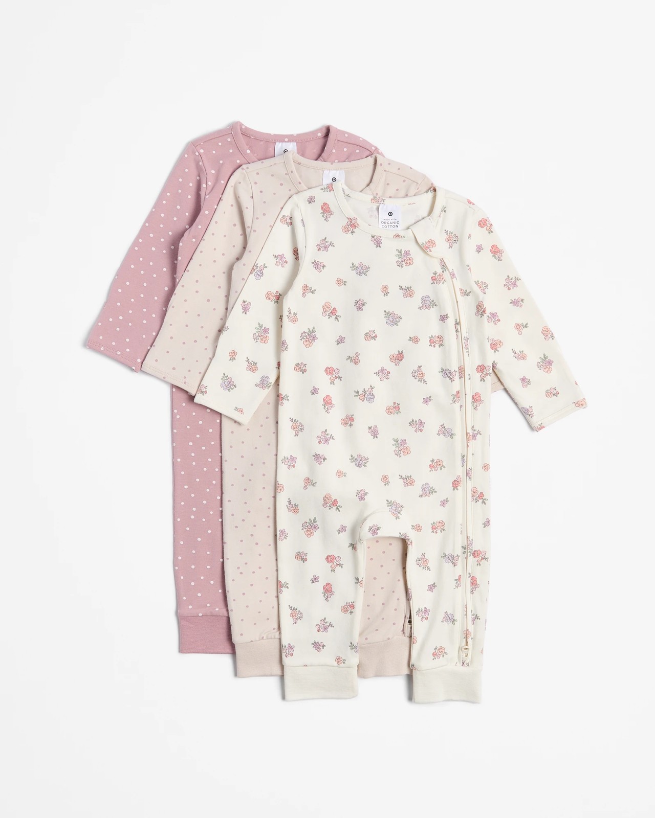 Envelop your little one in luxury with our Baby Organic Cotton Coveralls, the ideal choice for serene naps and lively playtimes. This trio of delightful coveralls showcases charming floral prints, made from soft organic cotton that's gentle on tender skin. Designed for ease with a two-way zip front, these coveralls simplify changing time. The round neckline and fold-over mitts add extra comfort, while the ribbed ankle cuffs provide a snug fit for bare feet. Choose this essential 3-pack for a blend of beauty and practicality.