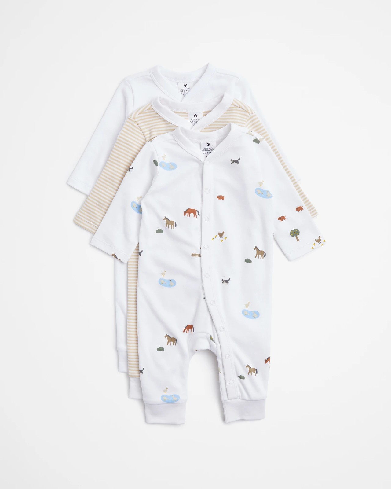 Introduce your little one to the world with style and comfort in these adorable 3 Pack Baby Organic Cotton Snap Coveralls. Crafted from certified organic cotton, these coveralls offer a regular fit and a wide selection of delightful colours and prints to choose from. The v-neck design, press stud front closure, long sleeves, and ribbed ancle cuffs ensure that your baby stays snug and cosy while they embark on their exciting adventures. Suitable for any occasion, these coveralls are perfect for keeping your little one looking fashionable and feeling super comfy. Treat your baby to the utmost luxury with these charming and versatile coveralls!