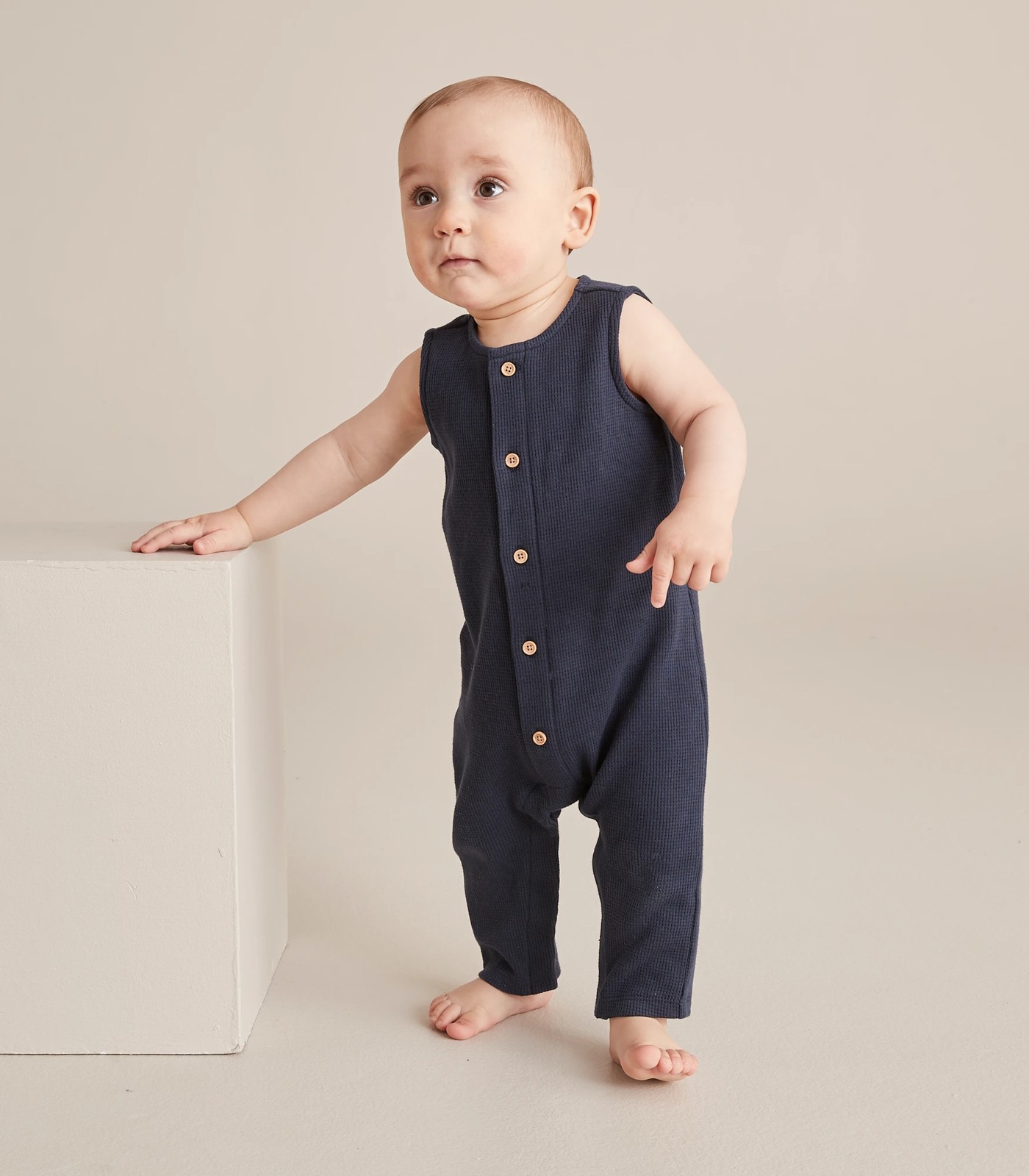 Crafted from certified organic cotton that's grown free from harmful chemicals, is soft to touch and comfortable to wear comes the Baby Organic Cotton Henley Waffle Romper, with a button down front and sleeveless design.