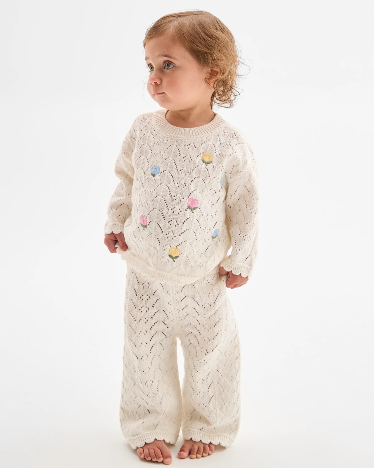 Treat your little one to adorable cosiness with this Baby Organic Cotton Knit 2 Piece Set. Made from organic cotton that's soft against delicate skin, this set is designed for comfort throughout the day. The charming pointelle knit and cheerful flower and leaf design on the top bring a playful feel. With a regular fit, handy ribbed crew neckline, and sweet scalloped hems, dressing is quick and simple. The stretchy elastic waistband on the pants makes nappy changes easy and ensures gentle support. Made for everyday smiles and snuggles, this two-piece set brings joy and comfort to any baby’s wardrobe. Add it to your cart and let your baby enjoy all-day comfort and cuteness.