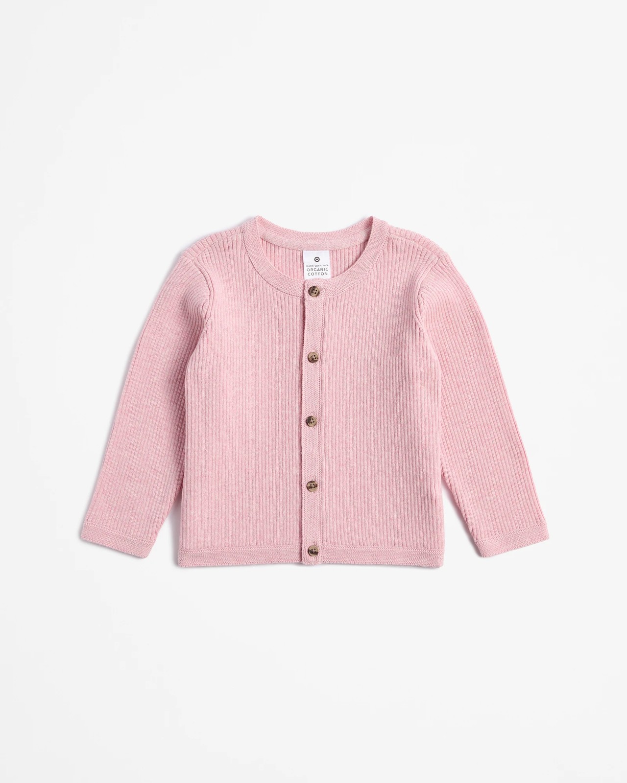 Keep your little one cosy and comfortable with our charming Baby Organic Cotton Knit Cardigan in a delicate Rose Marle shade. Made from pure organic cotton for a soft touch against sensitive skin, the button-down front makes dressing easy, and the ribbed texture adds a stylish flair. Ideal for layering, its long sleeves and round neck provide warmth on cooler days. Featuring a classic straight hem, it's a wonderful addition to your baby's wardrobe. Don't miss out on this adorable cardigan, perfect for any occasion.