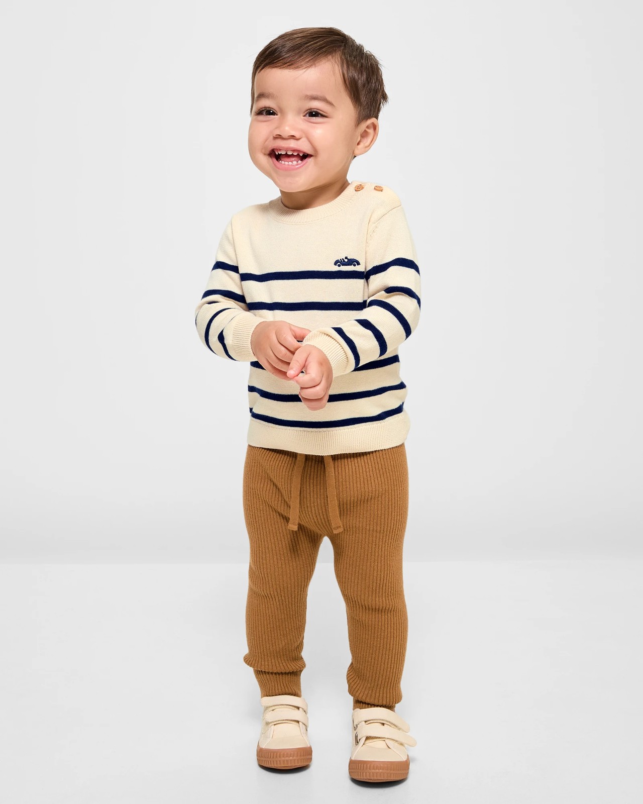 Dress your little one in our charming Baby Organic Cotton Knit Jumper. This adorable jumper showcases a playful car design on the chest, paired with timeless stripes. Made from soft, organic cotton, it ensures comfort throughout the day. Perfect for any occasion, this jumper offers a regular fit with a crew neck, long sleeves, and a straight hem. The button-up shoulder design makes dressing your baby easy, adding both style and practicality. Add this delightful knitwear to your baby's wardrobe for a touch of style and cosiness.