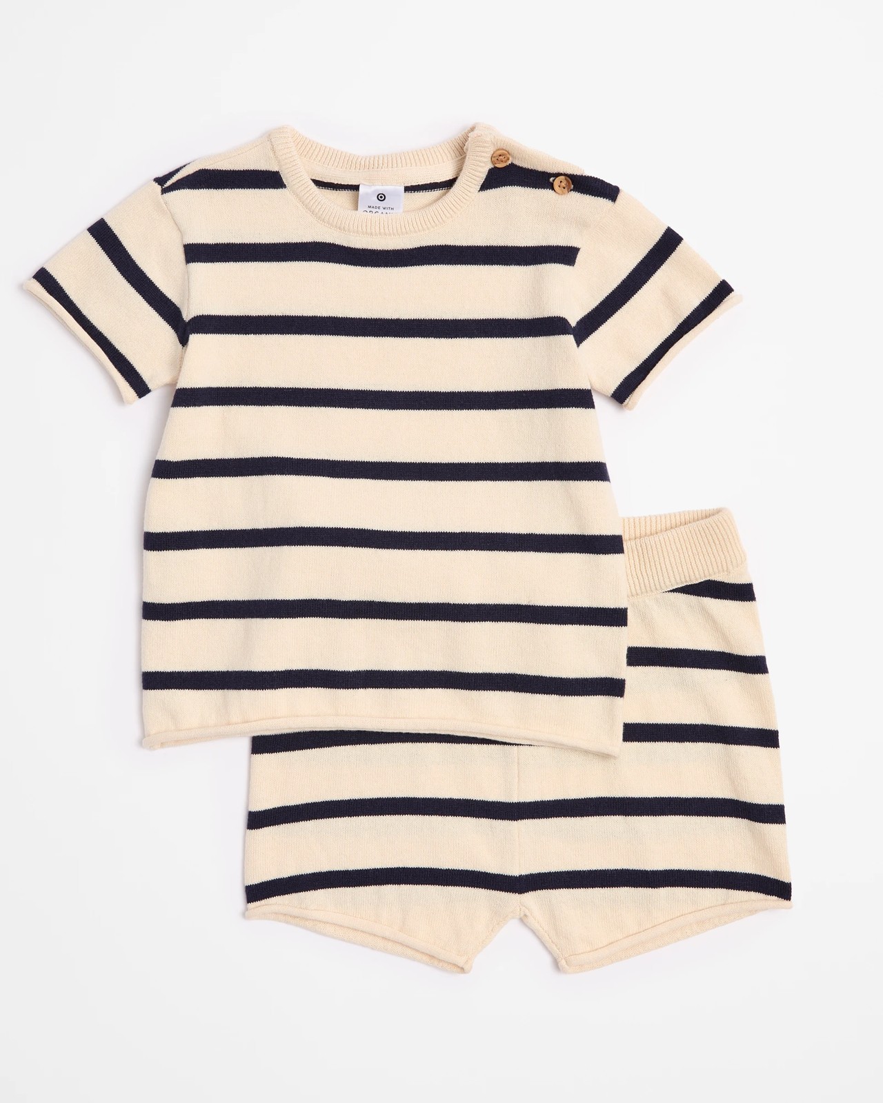 Discover the comfort for your little one with our Baby Organic Cotton Knit Tee & Shorts Set. This adorable 2-piece ensemble features a snug top with a crew neck and short sleeves, perfectly paired with matching shorts that have an easy elastic waistband. The charming striped pattern adds a touch of fun, while the buttons on one shoulder make changing a breeze. Ideal for playtime and casual outings, this set is a must-have addition to your baby’s wardrobe.