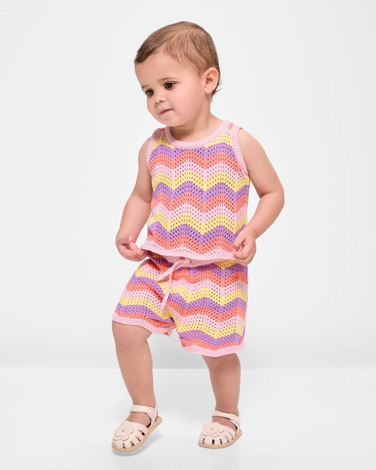 Introduce your baby to both comfort and style with this adorable top and shorts ensemble. Made from soft cotton knit, the set features a delightful wavy stripe pattern that adds a playful touch. The sleeveless top has a round neck and wavy hem, perfectly matched by the elastic waistband shorts for a secure fit. This 2 piece outfit is perfect for everyday wear, whether at home or on a casual outing. Your little one will not only look charming but also feel cosy in this delightful set.