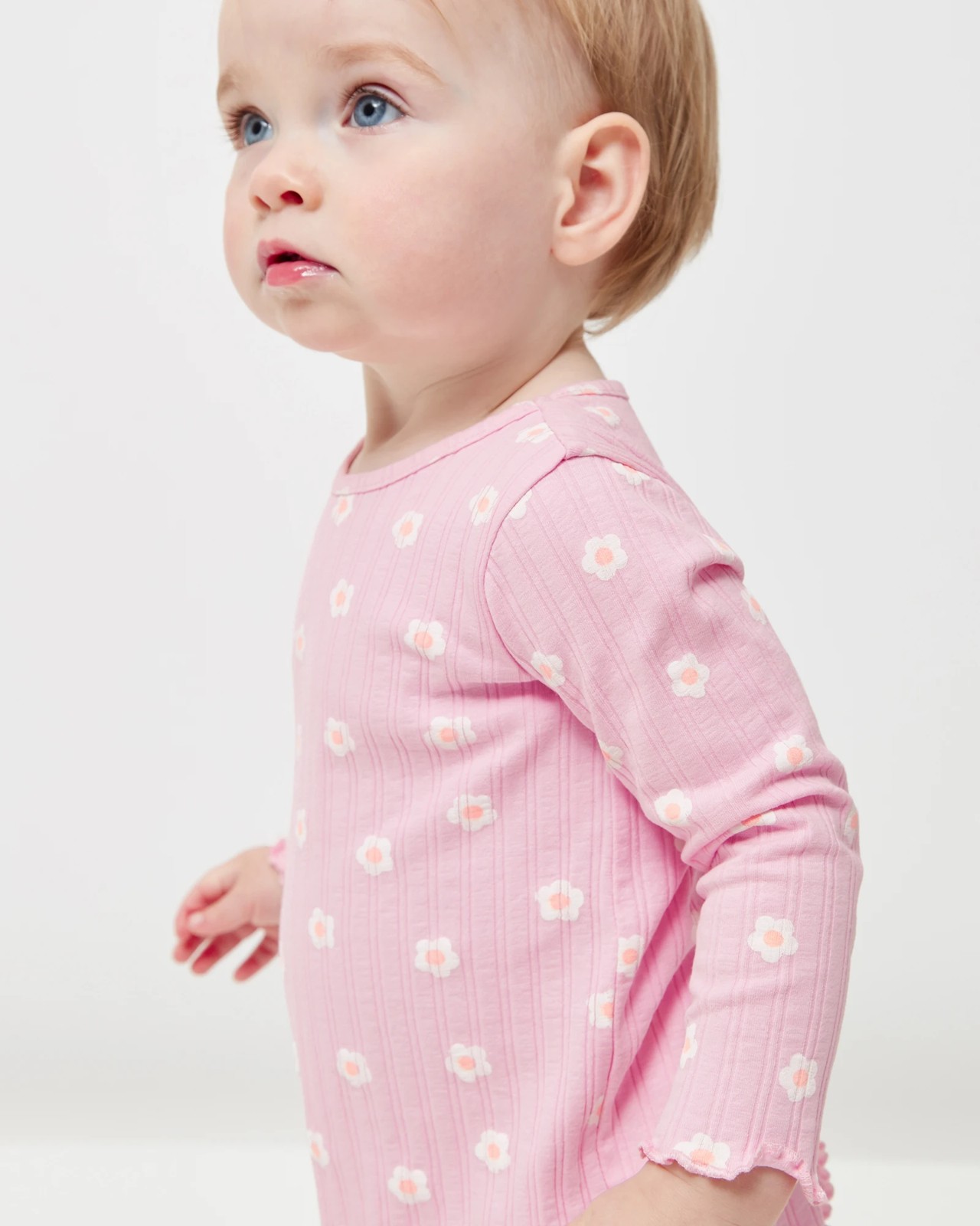 Our cozy and comfortable Baby Organic Cotton Long Sleeve Rib Top is perfect for your little one's everyday wardrobe. This stylish top is crafted from soft, organic cotton rib fabric and features an all-over print that will make your little one stand out. The round neck design provide a classic touch while the lettuce hem adds a unique touch of style. Plus, its regular fit ensures a comfortable fit all day long!