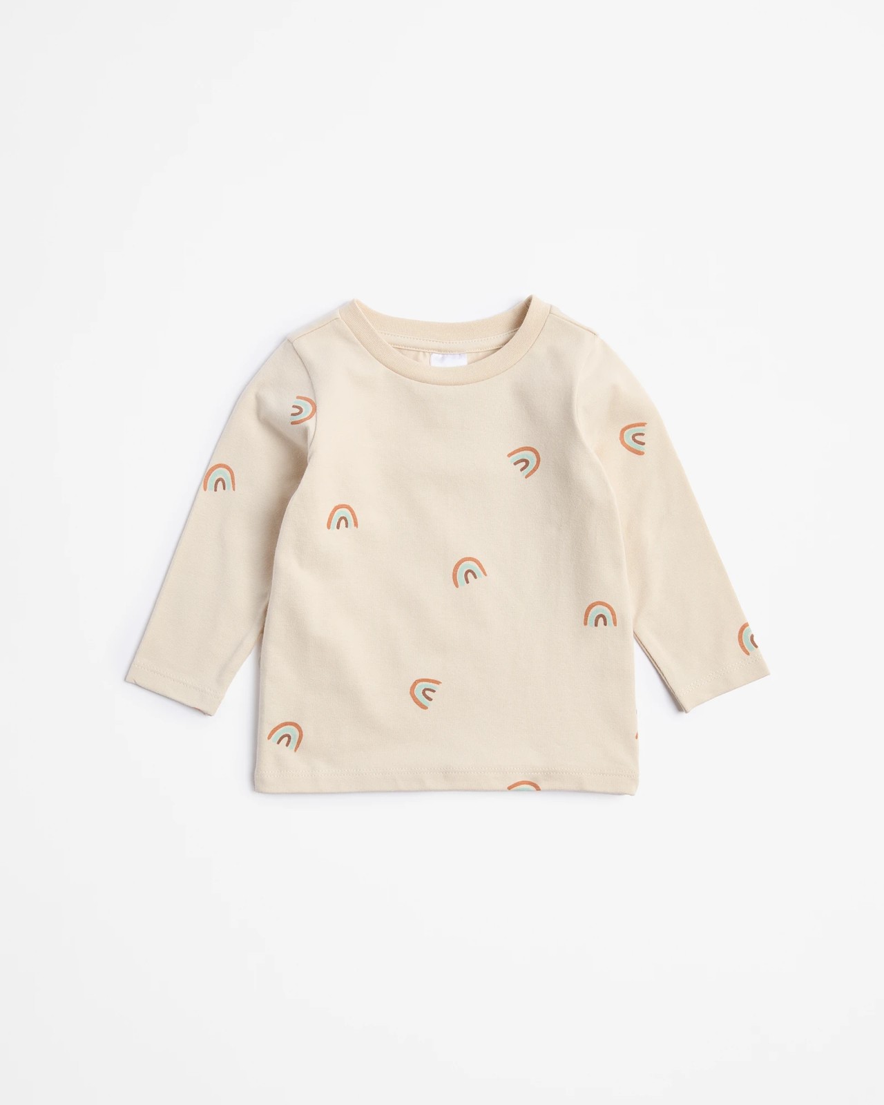 Give your little one comfort and charming style with our Baby Organic Cotton Print T-Shirt, featuring an enchanting rainbow pattern. This soft, stretchy fabric ensures a cosy fit for your baby while allowing easy movement throughout playtime. The ribbed crew neck and long sleeves provide a snug, comfortable fit, making it perfect for daily wear. Its vibrant print adds a touch of joy to your baby's wardrobe. Bring this delightful T-shirt home today and brighten up your baby's day.
