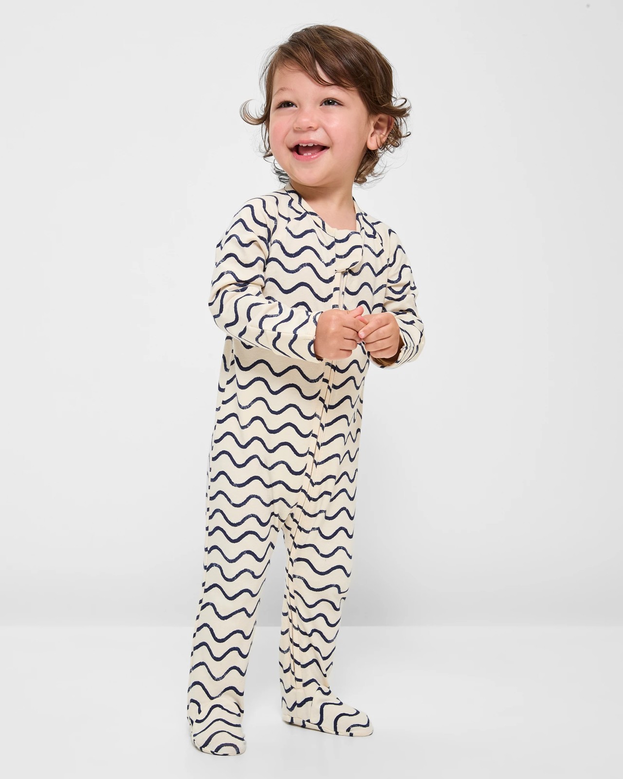 Cosy and practical, the Baby Organic Cotton Print Zip Coverall in Waves design is perfect for your little one's first adventures. Made from gentle organic cotton, this regular fit coverall features a charming all-over print that adds a touch of fun. The round neck and long raglan sleeves ensure comfortable movement, while the fold-over mitts and covered feet provide snug warmth. The two-way zip front makes dressing and nappy changes fast and easy. Make this essential part of their wardrobe and see them smile with comfort and joy.