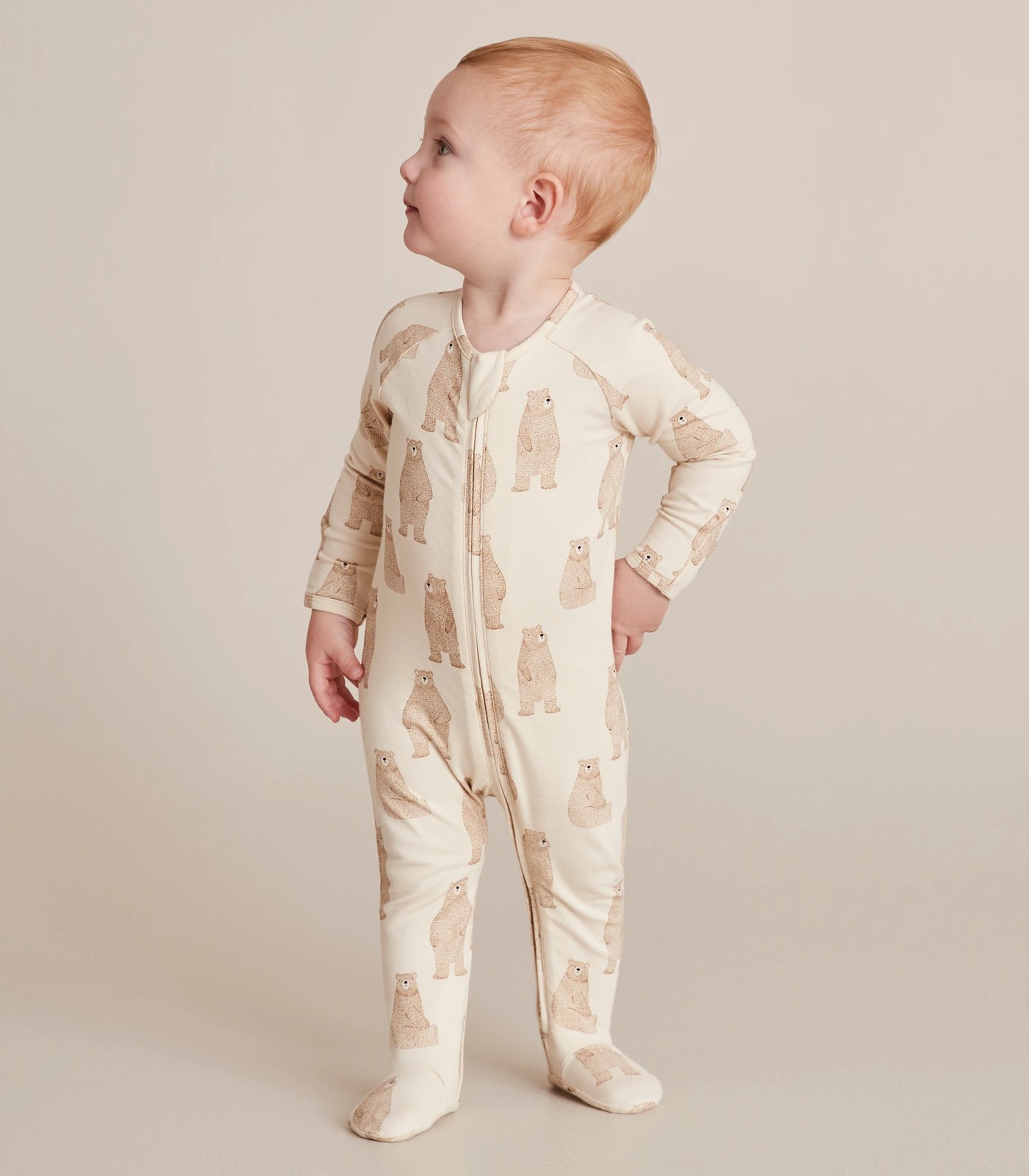 The vibrant all-over print adds a playful touch to the design. With its round neck, long raglan sleeves for full range of movement, fold-over mitts, two-way zip front, and covered feet, this coverall is designed with practicality in mind. Dress your little one in this adorable coverall and rest assured knowing they are adorned in pure, organic goodness.