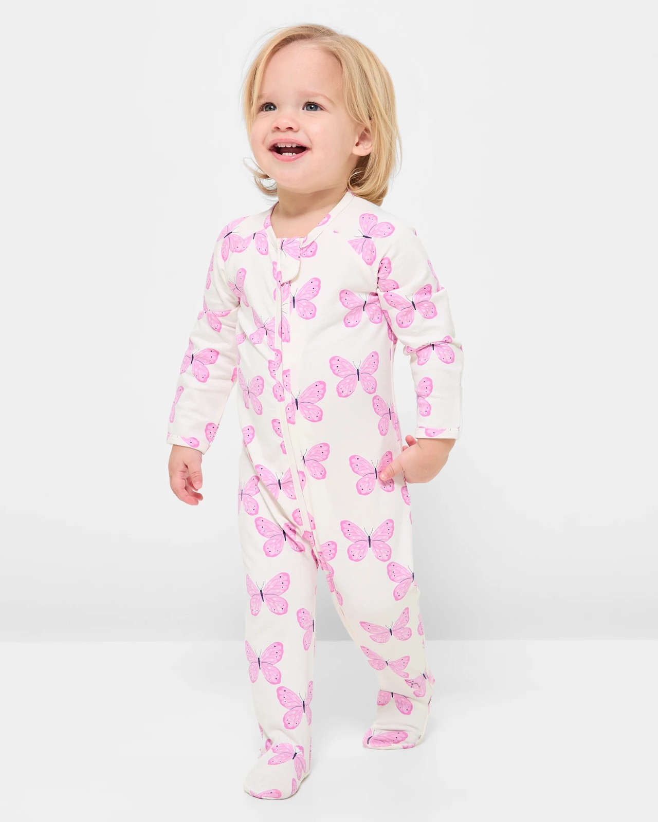 Introduce your little one to comfort with our Baby Organic Cotton Print Zip Coverall. Made from soft, organic cotton, this coverall features a charming all-over print that your baby will love. The round neck and long raglan sleeves ensure easy movement for playful days. Fold-over mitts and covered feet provide extra warmth, while the two-way zip front simplifies changing times. Perfect for both day and night, this cosy essential is a delightful addition to your babys wardrobe. Dont miss out on this blend of style and practicality.