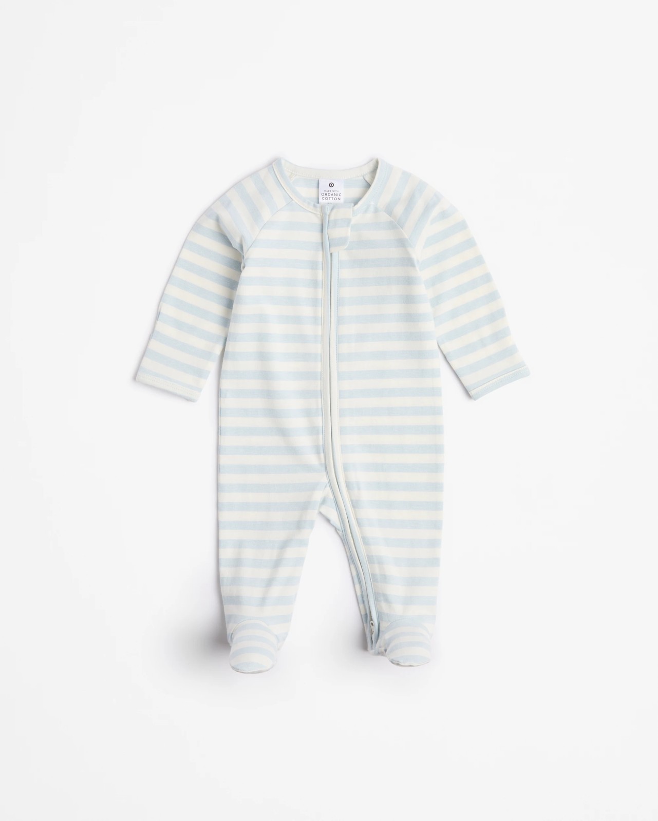 Baby Organic Cotton Print Zip Coverall - Cream Blue Stripe