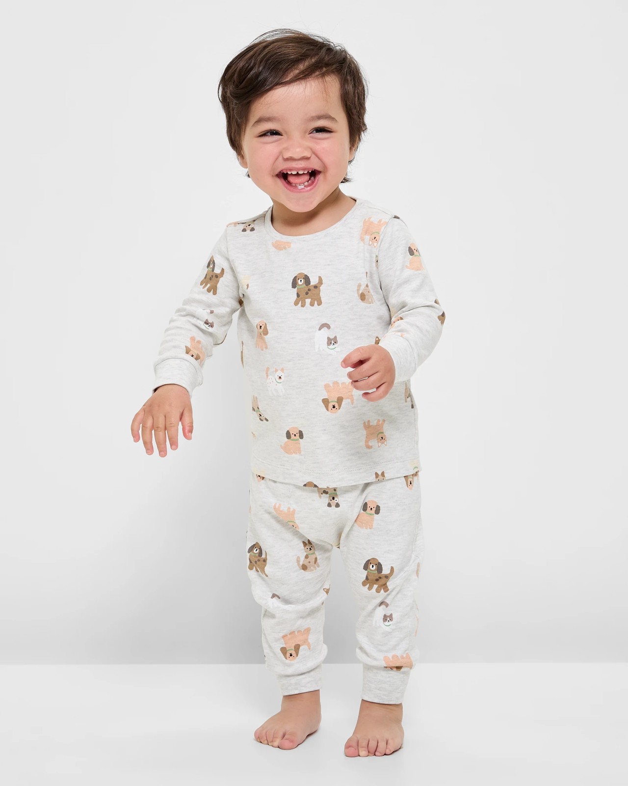 Give your little one the ultimate comfort with this adorable Baby Organic Cotton Pyjama Set showcasing charming dog prints. The set features a cosy top with a ribbed crew neck and long sleeves, perfect for keeping warm on cooler nights. The matching bottoms come with a stretchy waistband and ribbed cuffs for a snug fit. Both pieces are made from soft, organic cotton , viscose blend with a regular fit to allow for ease of movement. Ideal for a restful night’s sleep, this 2-piece set is an essential addition to your baby's night-time attire. Order now for your baby.