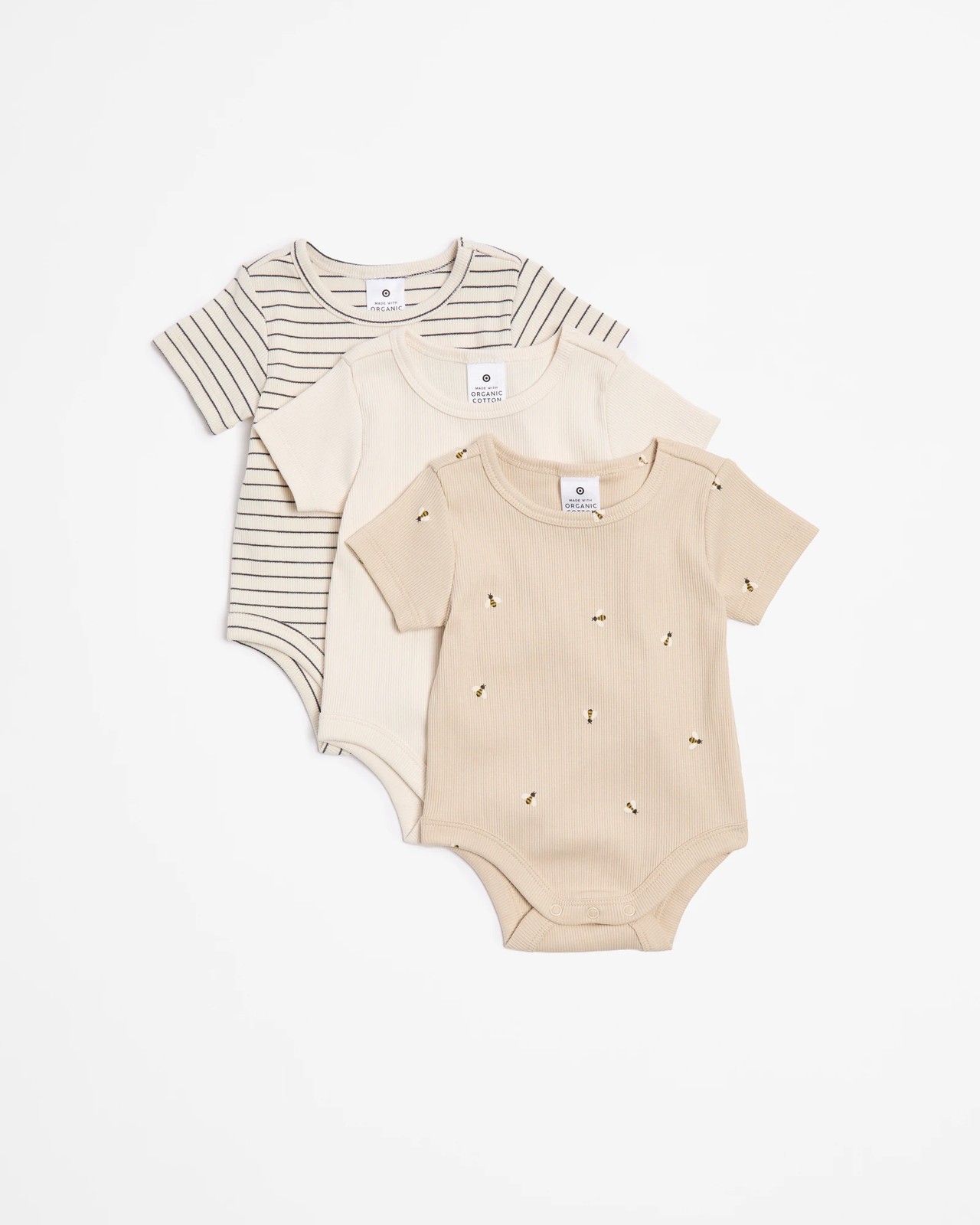 Dress your little one in pure comfort with our Baby Organic Cotton Rib Bodysuits. This charming set of three comes in a mix of adorable colours and patterns, making it perfect for daily wear. Featuring a cosy regular fit and soft ribbed texture, these bodysuits keep your baby snug and stylish. The round neck and short sleeves make for easy dressing, while the press studs at the crotch simplify nappy changes. Enhance your baby's wardrobe with these lovely essentials!